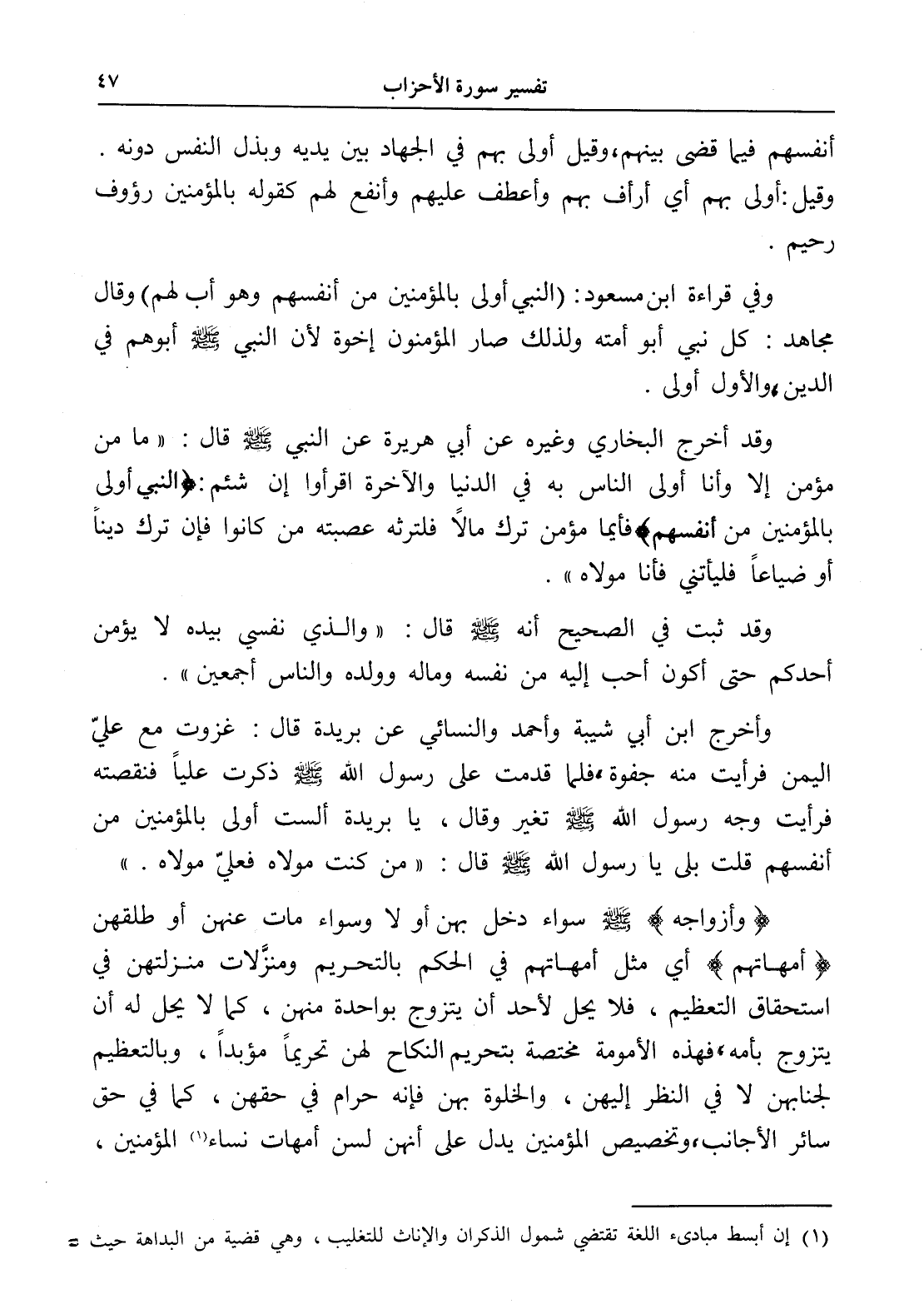 لا تحتاج إلى هذه الفنقيلات اللجوج فإذا قال الله " يا أيها الذين آمنوا " تناول نداؤه اللائي آمن، وإذا قال: " إنما المؤمنون إخوة " دل على إخوة المؤمنات فأزواجه - صلى الله عليه وسلم - أمهات المؤمنات كما هن أمهات ذكران المؤمنين. المطيعي.