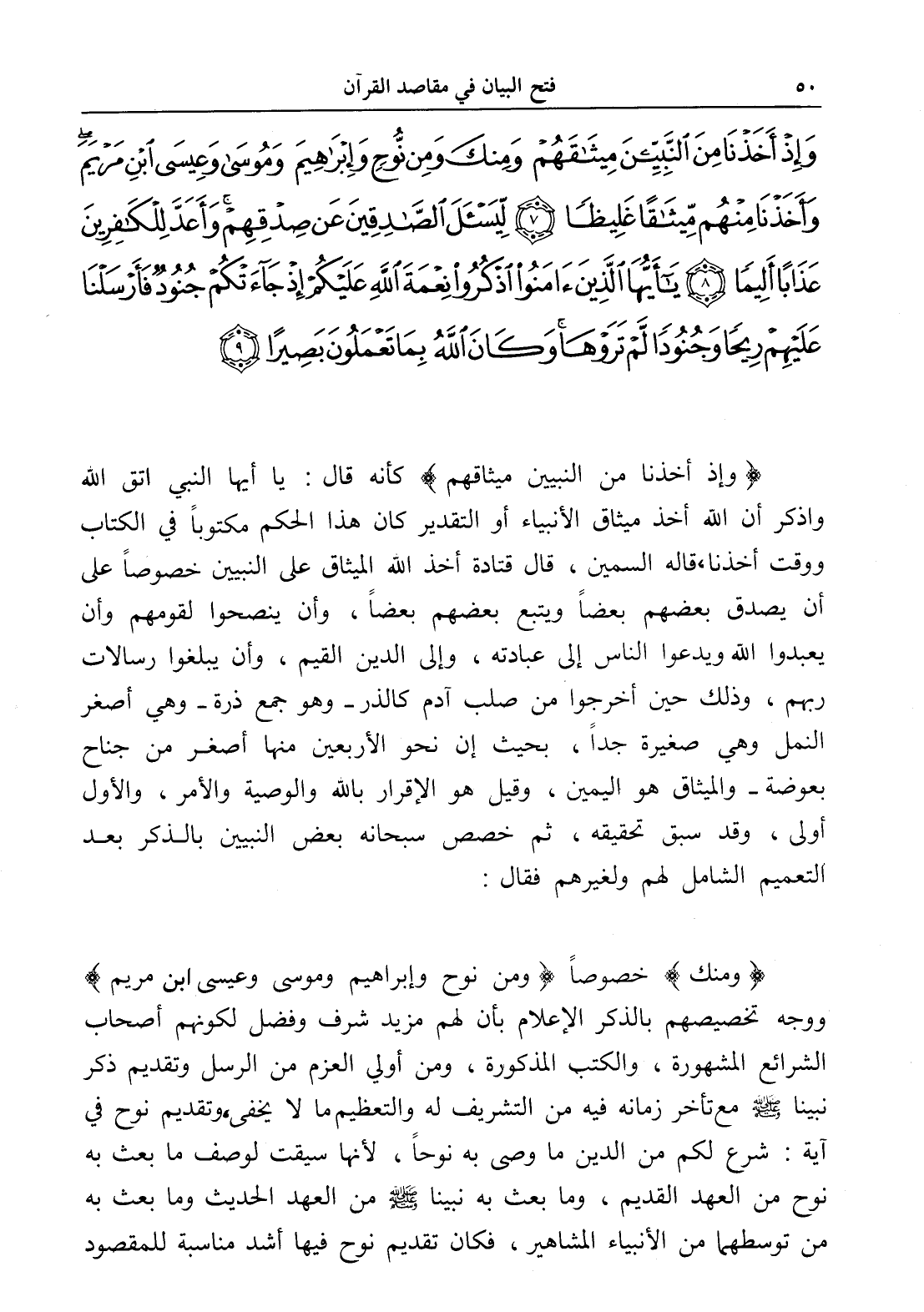(وَإِذْ أَخَذْنَا مِنَ النَّبِيِّينَ مِيثَاقَهُمْ وَمِنْكَ وَمِنْ نُوحٍ وَإِبْرَاهِيمَ وَمُوسَى وَعِيسَى ابْنِ مَرْيَمَ وَأَخَذْنَا مِنْهُمْ مِيثَاقاً غَلِيظاً (7) لِيَسْأَلَ الصَّادِقِينَ عَنْ صِدْقِهِمْ وَأَعَدَّ لِلْكَافِرِينَ عَذَاباً أَلِيماً (8) يَا أَيُّهَا الَّذِينَ آمَنُوا اذْكُرُوا نِعْمَةَ اللَّهِ عَلَيْكُمْ إِذْ جَاءَتْكُمْ جُنُودٌ فَأَرْسَلْنَا عَلَيْهِمْ رِيحاً وَجُنُوداً لَمْ تَرَوْهَا وَكَانَ اللَّهُ بِمَا تَعْمَلُونَ بَصِيراً (9))