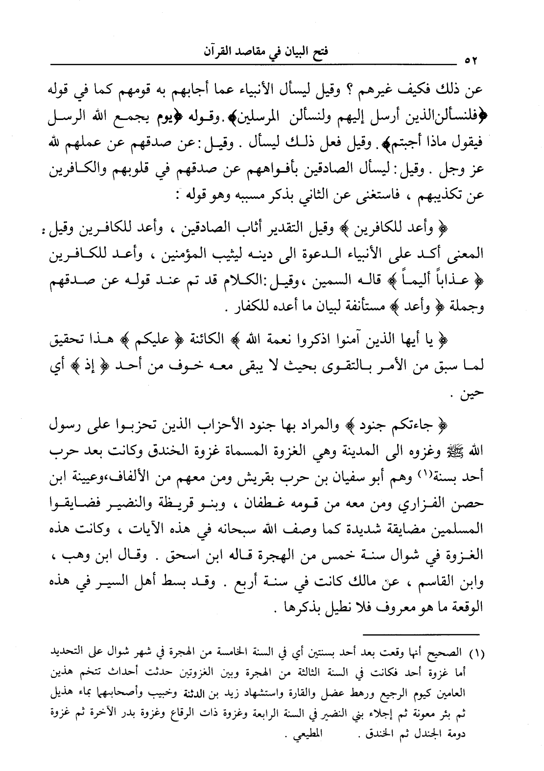 (¬1) الصحيح أنها وقعت بعد أحد بسنتين أي في السنة الخامسة من الهجرة في شهر شوال على التحديد أما غزوة أحد فكانت في السنة الثالثة من الهجرة وبين الغزوتين حدثت أحداث تتخم هذين العامين كيوم الرجيع ورهط عضل والقارة واستشهاد زيد بن الدثنة وخبيب وأصحابهما بماء هذيل ثم بئر معونة ثم إجلاء بني النضير في السنة الرابعة وغزوة ذات الرقاع وغزوة بدر الآخرة ثم غزوة دومة الجندل ثم الخندق. المطيعي.
