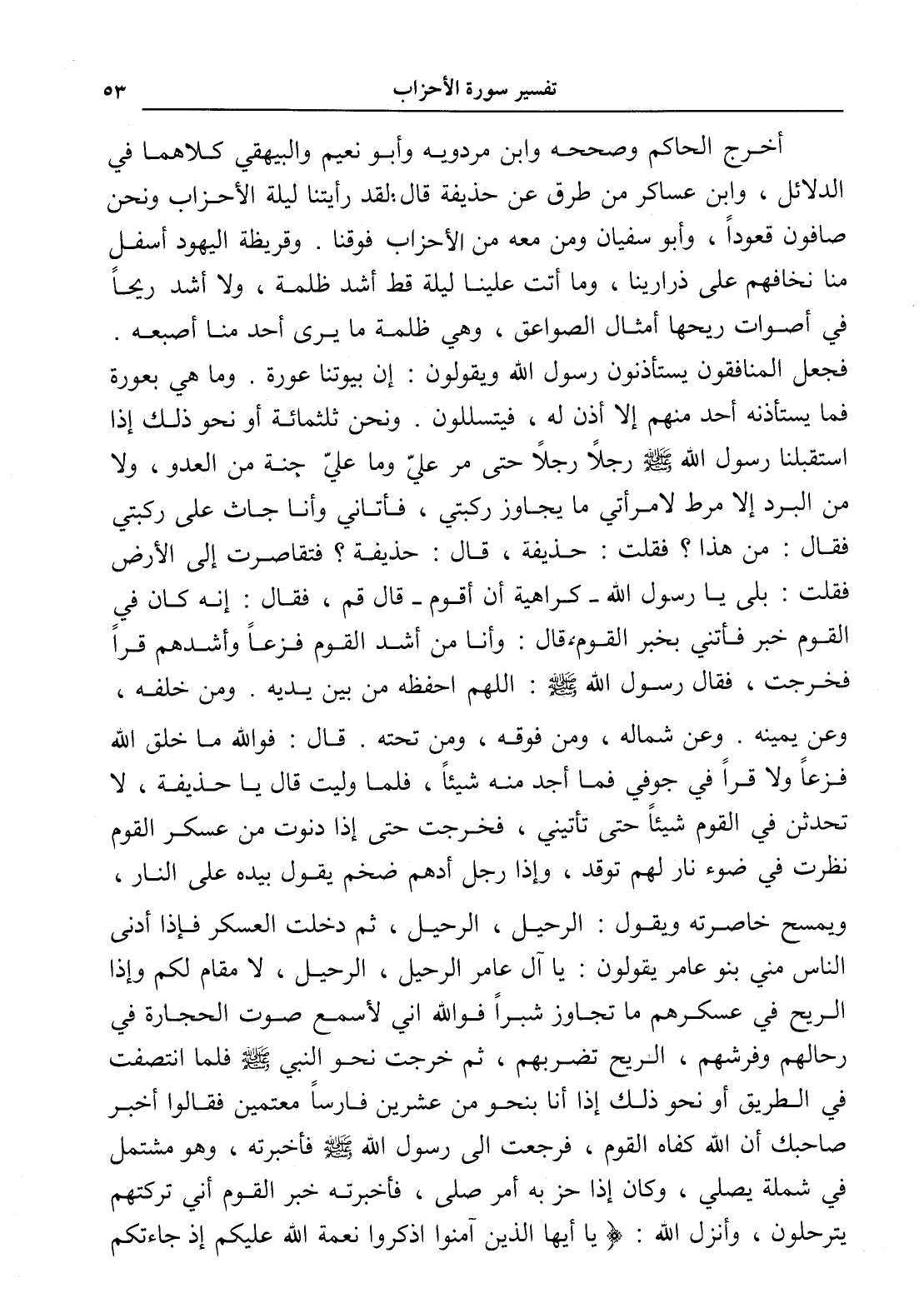 فجعل المنافقون يستأذنون رسول الله ويقولون: إن بيوتنا عورة. وما هي بعورة فما يستأذنه أحد منهم إلا أذن له، فيتسللون. ونحن ثلثمائة أو نحو ذلك إذا استقبلنا رسول الله - صلى الله عليه وسلم - رجلاً رجلاً حتى مر عليّ وما عليّ جنة من العدو، ولا من البرد إلا مرط لامرأتي ما يجاوز ركبتي، فأتاني وأنا جاث على ركبتي فقال: من هذا؟ فقلت: حذيفة، قال: حذيفة؟ فتقاصرت إلى الأرض فقلت: بلى يا رسول الله -كراهية أن أقوم- قال قم، فقال: إنه كان في القوم خبر فأتني بخبر القوم؟ قال: وأنا من أشد القوم فزعاً وأشدهم قراً فخرجت، فقال رسول الله - صلى الله عليه وسلم -: اللهم احفظه من بين يديه. ومن خلفه، وعن يمينه. وعن شماله، ومن فوقه، ومن تحته. قال: فوالله ما خلق الله فزعاً ولا قراً في جوفي فما أجد منه شيئاًً، فلما وليت قال يا حذيفة، لا تحدثن في القوم شيئاًً حتى تأتيني، فخرجت حتى إذا دنوت من عسكر القوم نظرت في ضوء نار لهم توقد، وإذا رجل أدهم ضخم يقول بيده على النار، ويمسح خاصرته ويقول: الرحيل، الرحيل، ثم دخلت العسكر فإذا أدنى الناس مني بنو عامر يقولون: يا آل عامر الرحيل، الرحيل، لا مقام لكم وإذا الريح في عسكرهم ما تجاوز شبراً فوالله إني لأسمع صوت الحجارة في رحالهم وفرشهم، الريح تضربهم، ثم خرجت نحو النبي - صلى الله عليه وسلم - فلما انتصفت في الطريق أو نحو ذلك إذا أنا بنحو من عشرين فارساً معتمين فقالوا أخبر صاحبك أن الله كفاه القوم، فرجعت إلى رسول الله - صلى الله عليه وسلم - فأخبرته، وهو مشتمل في شملة يصلي، وكان إذا حزبه أمر صلى، فأخبرته خبر القوم أني تركتهم يترحلون، وأنزل الله: (يا أيها الذين آمنوا اذكروا نعمة الله عليكم إذ جاءتكم