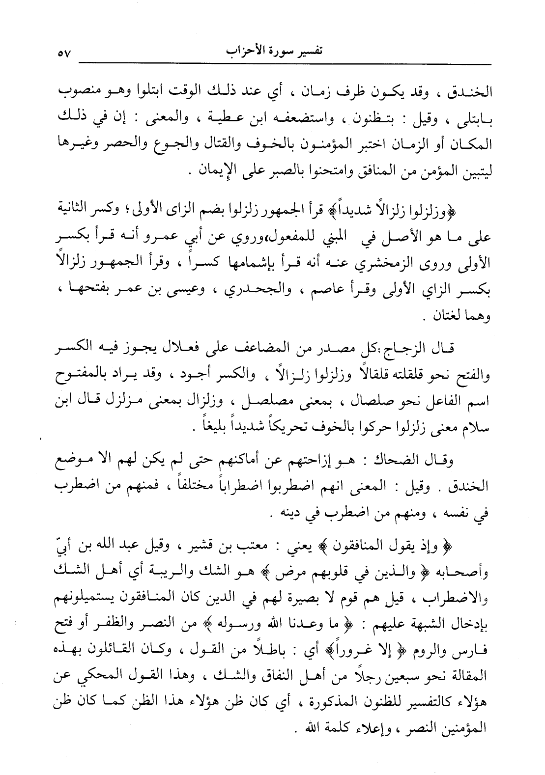 (وزلزلوا زلزالاً شديداً) قرأ الجمهور زلزلوا بضم الزاى الأولى؛ وكسر الثانية على ما هو الأصل في المبني للمفعول، وروي عن أبي عمرو أنه قرأ بكسر الأولى وروى الزمخشري عنه أنه قرأ بإشمامها كسراً، وقرأ الجمهور زلزالاً بكسر الزاي الأولى وقرأ عاصم، والجحدري، وعيسى بن عمر بفتحها، وهما لغتان.