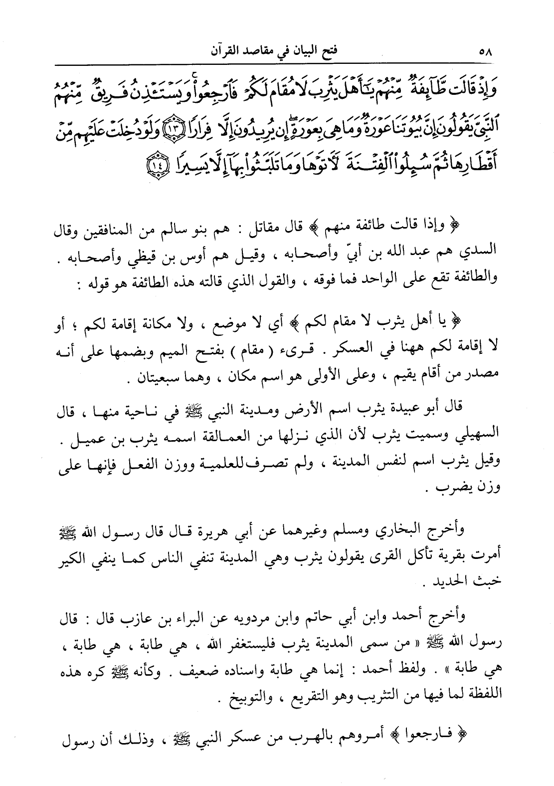 (وَإِذْ قَالَتْ طَائِفَةٌ مِنْهُمْ يَا أَهْلَ يَثْرِبَ لَا مُقَامَ لَكُمْ فَارْجِعُوا وَيَسْتَأْذِنُ فَرِيقٌ مِنْهُمُ النَّبِيَّ يَقُولُونَ إِنَّ بُيُوتَنَا عَوْرَةٌ وَمَا هِيَ بِعَوْرَةٍ إِنْ يُرِيدُونَ إِلَّا فِرَاراً (13) وَلَوْ دُخِلَتْ عَلَيْهِمْ مِنْ أَقْطَارِهَا ثُمَّ سُئِلُوا الْفِتْنَةَ لَآتَوْهَا وَمَا تَلَبَّثُوا بِهَا إِلَّا يَسِيراً (14))