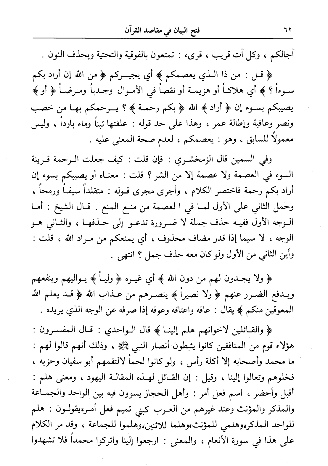 وفي السمين قال الزمخشري: فإن قلت: كيف جعلت الرحمة قرينة السوء في العصمة ولا عصمة إلا من الشر؟ قلت: معناه أو يصيبكم بسوء إن أراد بكم رحمة فاختصر الكلام، وأجرى مجرى قوله: (متقلداً سيفاً ورمحاً، وحمل الثاني على الأول لما في العصمة من منع المنع. قال الشيخ: أما الوجه الأول ففيه حذف جملة لا ضرورة تدعو إلى حذفها، والثاني هو الوجه، لا سيما إذا قدر مضاف محذوف، أي يمنعكم من مراد الله، قلت: وأين الثاني من الأول ولو كان معه حذف جمل؟ انتهى.