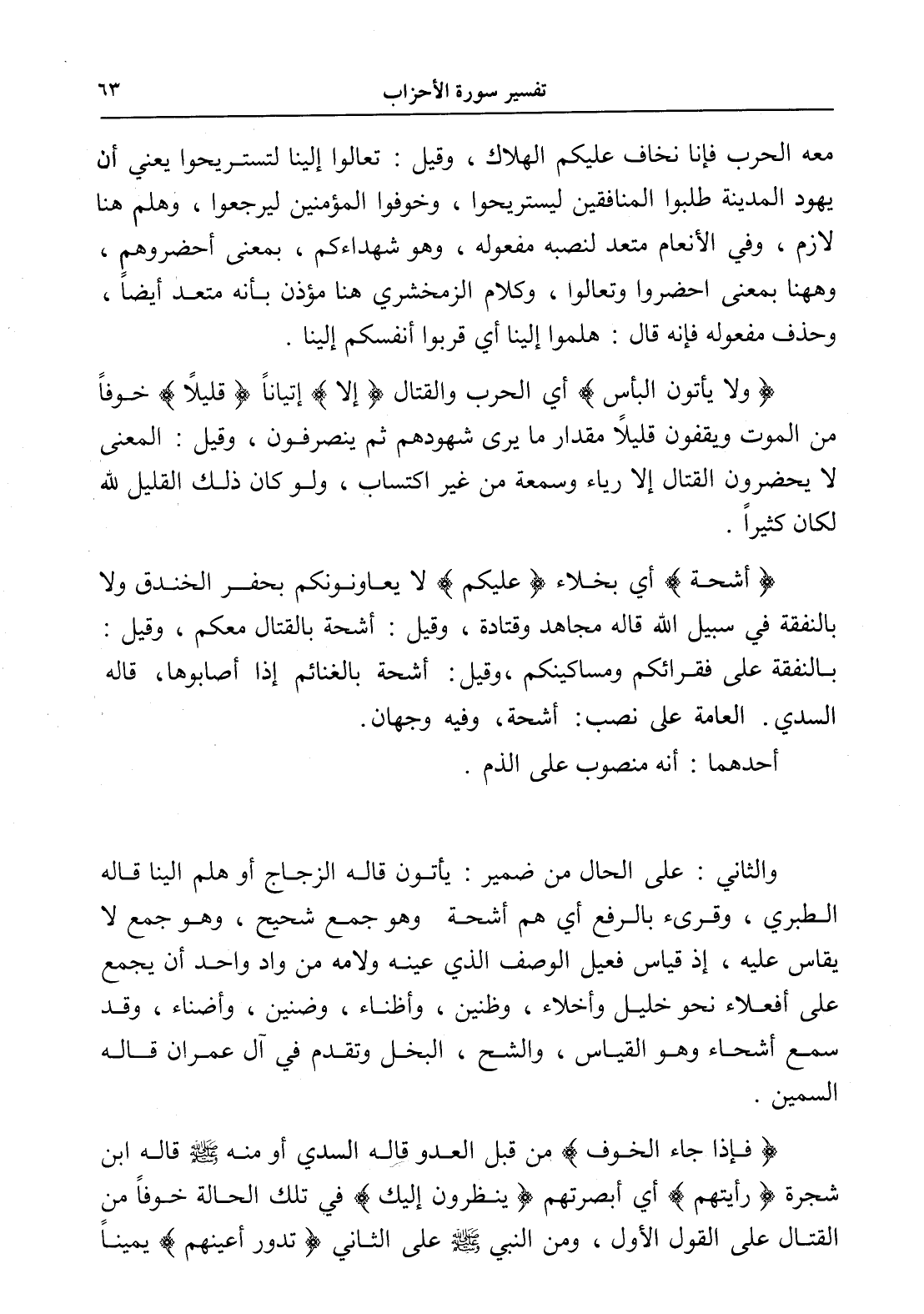 والثاني: على الحال من ضمير: يأتون قاله الزجاج أو هلم إلينا قاله الطبري، وقرىء بالرفع أي هم أشحة وهو جمع شحيح، وهو جمع لا يقاس عليه، إذ قياس فعيل الوصف الذي عينه ولامه من واد واحد أن يجمع على أفعلاء نحو خليل وأخلاء، وظنين، وأظناء، وضنين، وأضناء، وقد سمع أشحاء وهو القياس، والشح، البخل وتقدم في آل عمران قاله السمين.