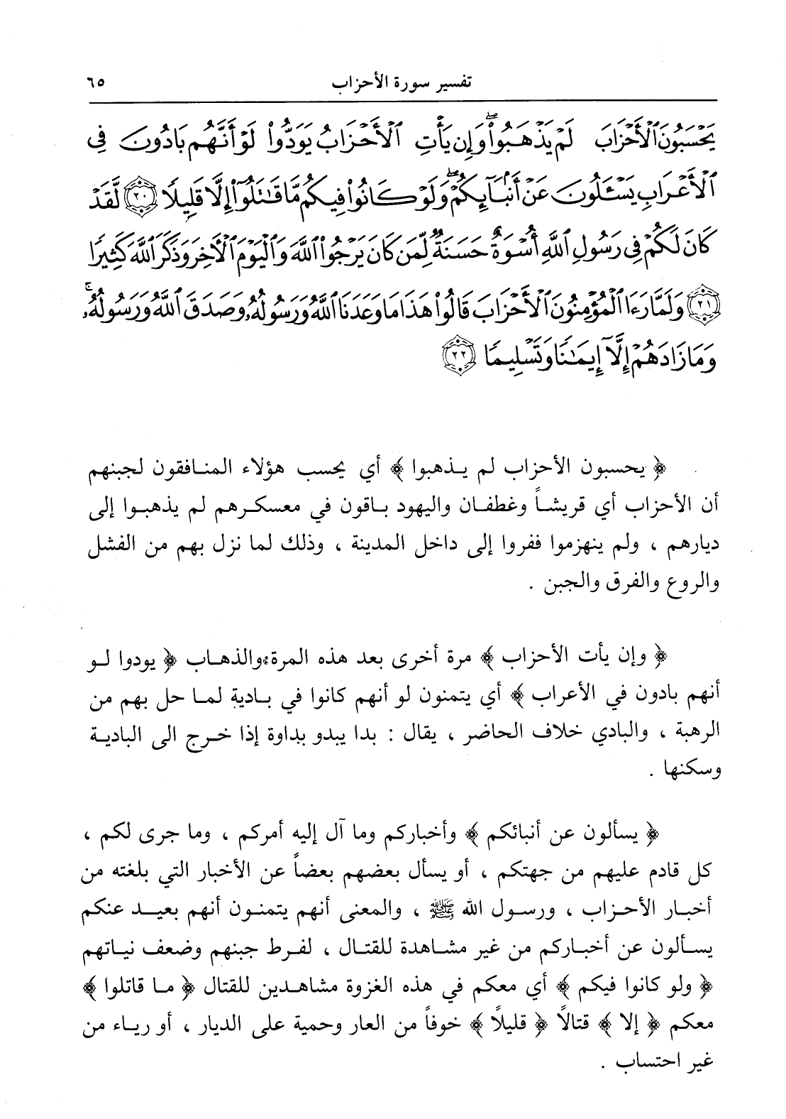 (يَحْسَبُونَ الْأَحْزَابَ لَمْ يَذْهَبُوا وَإِنْ يَأْتِ الْأَحْزَابُ يَوَدُّوا لَوْ أَنَّهُمْ بَادُونَ فِي الْأَعْرَابِ يَسْأَلُونَ عَنْ أَنْبَائِكُمْ وَلَوْ كَانُوا فِيكُمْ مَا قَاتَلُوا إِلَّا قَلِيلاً (20) لَقَدْ كَانَ لَكُمْ فِي رَسُولِ اللَّهِ أُسْوَةٌ حَسَنَةٌ لِمَنْ كَانَ يَرْجُو اللَّهَ وَالْيَوْمَ الْآخِرَ وَذَكَرَ اللَّهَ كَثِيراً (21) وَلَمَّا رَأَى الْمُؤْمِنُونَ الْأَحْزَابَ قَالُوا هَذَا مَا وَعَدَنَا اللَّهُ وَرَسُولُهُ وَصَدَقَ اللَّهُ وَرَسُولُهُ وَمَا زَادَهُمْ إِلَّا إِيمَاناً وَتَسْلِيماً (22))