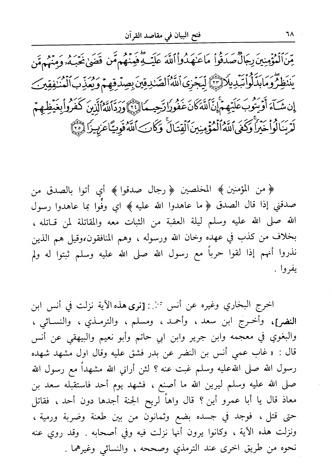 مِنَ الْمُؤْمِنِينَ رِجَالٌ صَدَقُوا مَا عَاهَدُوا اللَّهَ عَلَيْهِ فَمِنْهُمْ مَنْ قَضَى نَحْبَهُ وَمِنْهُمْ مَنْ يَنْتَظِرُ وَمَا بَدَّلُوا تَبْدِيلاً (23) لِيَجْزِيَ اللَّهُ الصَّادِقِينَ بِصِدْقِهِمْ وَيُعَذِّبَ الْمُنَافِقِينَ إِنْ شَاءَ أَوْ يَتُوبَ عَلَيْهِمْ إِنَّ اللَّهَ كَانَ غَفُوراً رَحِيماً (24) وَرَدَّ اللَّهُ الَّذِينَ كَفَرُوا بِغَيْظِهِمْ لَمْ يَنَالُوا خَيْراً وَكَفَى اللَّهُ الْمُؤْمِنِينَ الْقِتَالَ وَكَانَ اللَّهُ قَوِيّاً عَزِيزاً (25)