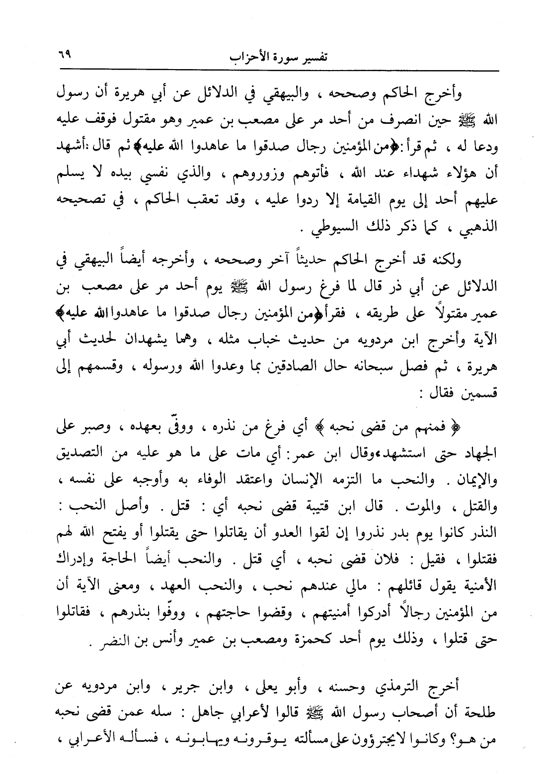 وأخرج الحاكم وصححه، والبيهقي في الدلائل عن أبي هريرة أن رسول الله - صلى الله عليه وسلم - حين انصرف من أحد مر على مصعب بن عمير وهو مقتول فوقف عليه ودعا له، ثم قرأ: (من المؤمنين رجال صدقوا ما عاهدوا الله عليه) ثم قال: أشهد أن هؤلاء شهداء عند الله، فأتوهم وزوروهم، والذي نفسي بيده لا يسلم عليهم أحد إلى يوم القيامة إلا ردوا عليه، وقد تعقب الحاكم، في تصحيحه الذهبي، كما ذكر ذلك السيوطي.