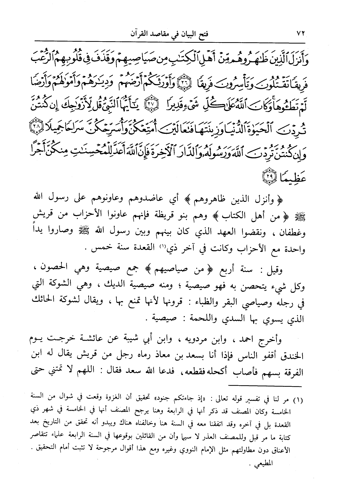 وَأَنْزَلَ الَّذِينَ ظَاهَرُوهُمْ مِنْ أَهْلِ الْكِتَابِ مِنْ صَيَاصِيهِمْ وَقَذَفَ فِي قُلُوبِهِمُ الرُّعْبَ فَرِيقاً تَقْتُلُونَ وَتَأْسِرُونَ فَرِيقاً (26) وَأَوْرَثَكُمْ أَرْضَهُمْ وَدِيَارَهُمْ وَأَمْوَالَهُمْ وَأَرْضاً لَمْ تَطَئُوهَا وَكَانَ اللَّهُ عَلَى كُلِّ شَيْءٍ قَدِيراً (27) يَا أَيُّهَا النَّبِيُّ قُلْ لِأَزْوَاجِكَ إِنْ كُنْتُنَّ تُرِدْنَ الْحَيَاةَ الدُّنْيَا وَزِينَتَهَا فَتَعَالَيْنَ أُمَتِّعْكُنَّ وَأُسَرِّحْكُنَّ سَرَاحاً جَمِيلاً (28) وَإِنْ كُنْتُنَّ تُرِدْنَ اللَّهَ وَرَسُولَهُ وَالدَّارَ الْآخِرَةَ فَإِنَّ اللَّهَ أَعَدَّ لِلْمُحْسِنَاتِ مِنْكُنَّ أَجْراً عَظِيماً (29)