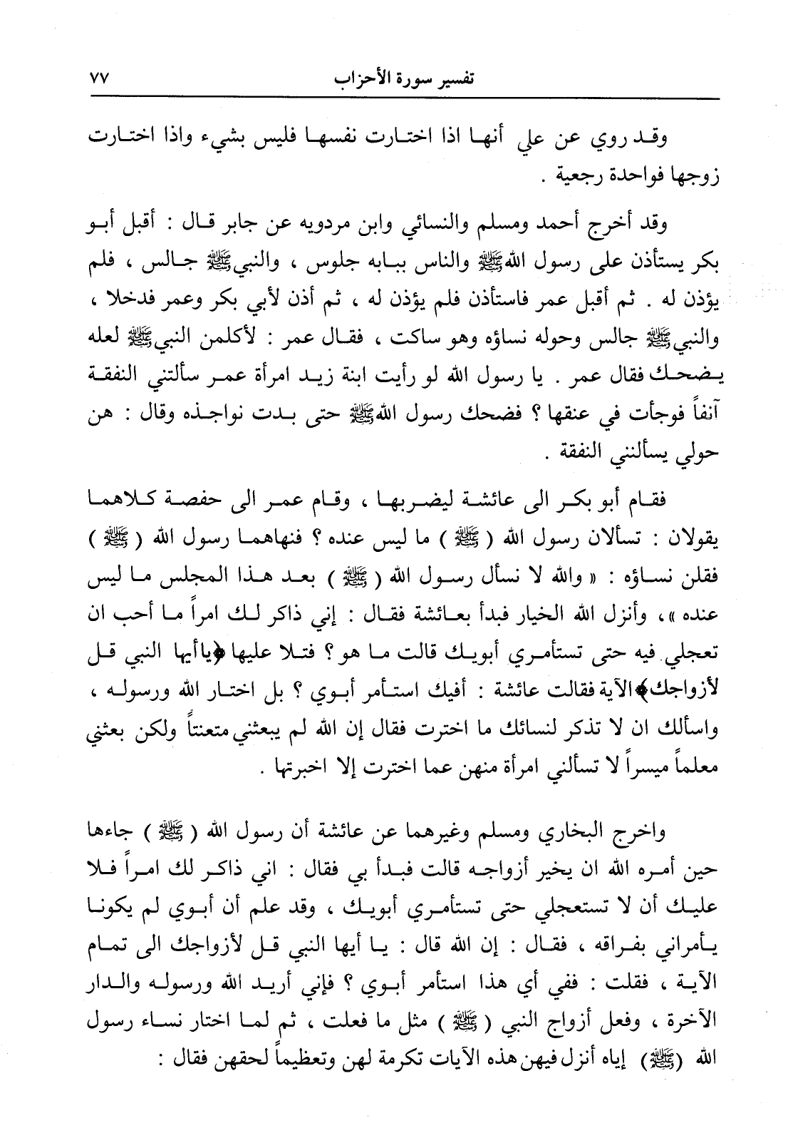 وأخرج البخاري ومسلم وغيرهما عن عائشة أن رسول الله (- صلى الله عليه وسلم -) جاءها حين أمره الله أن يخير أزواجه قالت فبدأ بي فقال: إني ذاكر لك أمراً فلا عليك أن لا تستعجلي حتى تستأمري أبويك، وقد علم أن أبوي لم يكونا يأمراني بفراقه، فقال: إن الله قال: يا أيها النبي قل لأزواجك إلى تمام الآية، فقلت: ففي أي هذا أستأمر أبوي؟ فإني أريد الله ورسوله والدار الآخرة، وفعل أزواج النبي (- صلى الله عليه وسلم -) مثل ما فعلت، ثم لما اختار نساء رسول الله (- صلى الله عليه وسلم -) إياه أنزل فيهن هذه الآيات تكرمة لهن وتعظيماً لحقهن فقال: