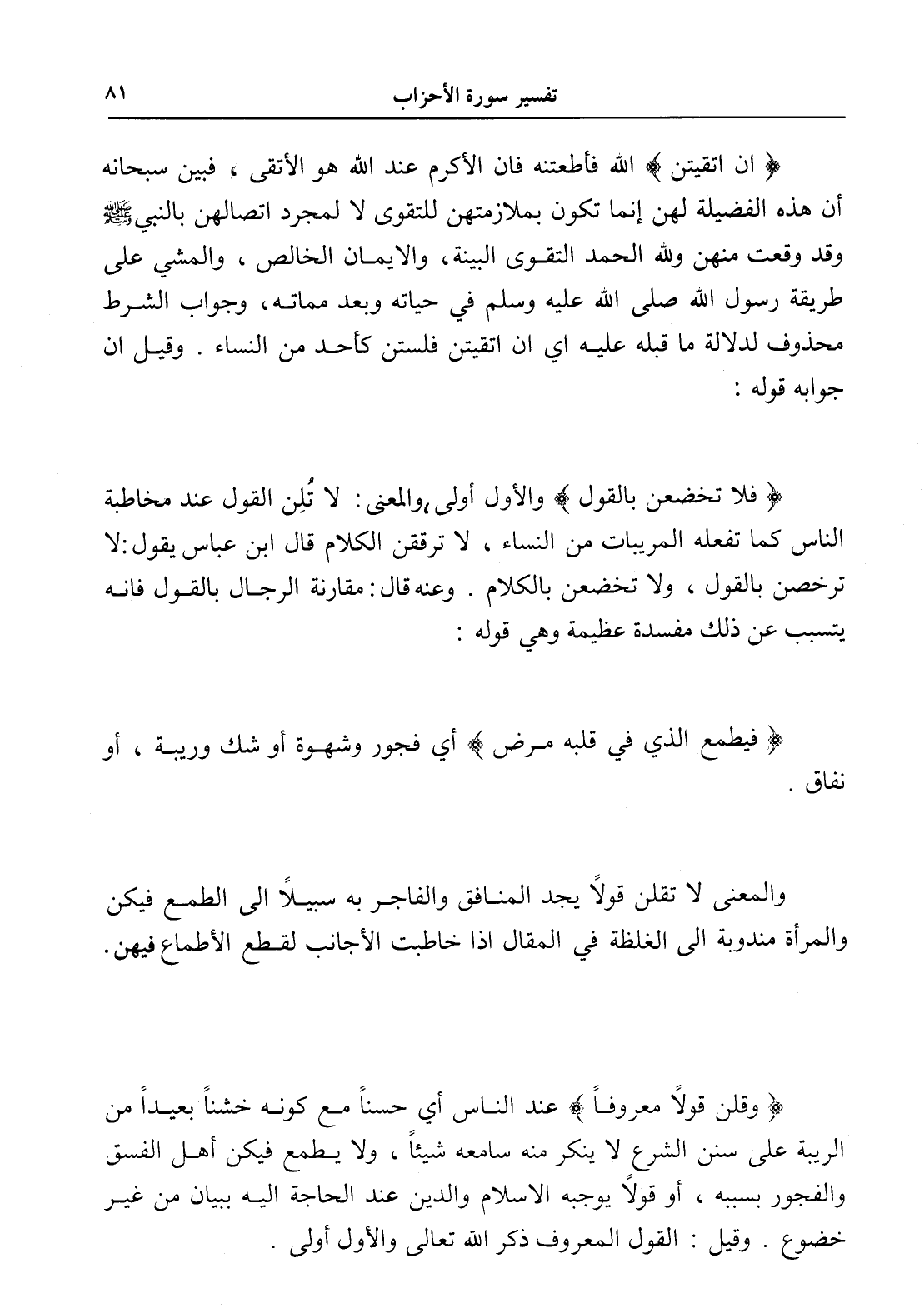 (فلا تخضعن بالقول) والأول أولى، والمعنى: لا تُلِن القول عند فخاطبة الناس كما تفعله المريبات من النساء، لا ترققن الكلام قال ابن عباس يقول: لا ترخصن بالقول، ولا تخضعن بالكلام. وعنه قال: مقارنة الرجال بالقول فإنه يتسبب عن ذلك مفسدة عظيمة وهي قوله: