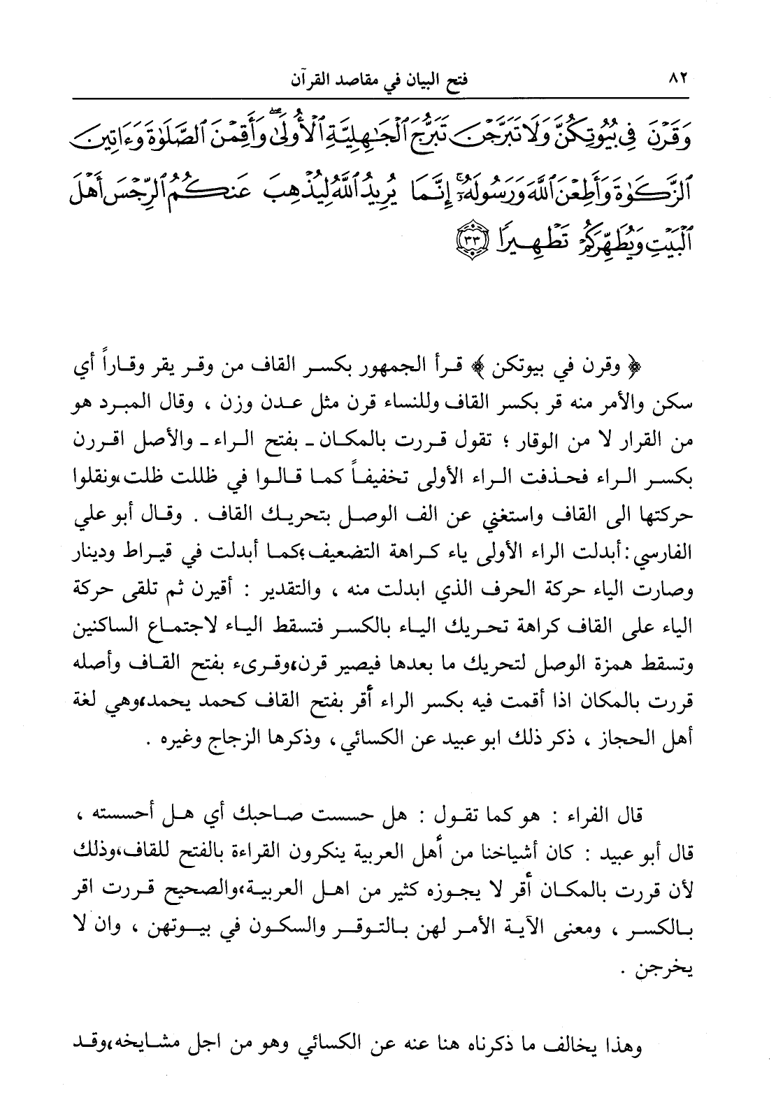 (وقرن في بيوتكن) قرأ الجمهور بكسر القاف من وقر يقر وقاراً أي سكن والأمر منه قر بكسر القاف وللنساء قرن مثل عدن وزن، وقال المبرد هو من القرار لا من الوقار؛ تقول قررت بالمكان -بفتح الراء- والأصل اقررن بكسر الراء فحذفت الراء الأولى تخفيفاً كما قالوا في ظللت ظلت، ونقلوا حركتها إلى القاف واستغني عن ألف الوصل بتحريك القاف. وقال أبو علي الفارسي: أبدلت الراء الأولى ياء كراهة التضعيف؛ كما أبدلت في قيراط ودينار وصارت الياء حركة الحرف الذي أبدلت منه، والتقدير: أقيرن ثم تلقى حركة الياء على القاف كراهة تحريك الياء بالكسر فتسقط الياء لاجتماع الساكنين وتسقط همزة الوصل لتحريك ما بعدها فيصير قرن، وقرىء بفتح القاف وأصله قررت بالمكان إذا أقمت فيه بكسر الراء أقر بفتح القاف كحمد يحمد، وهي لغة أهل الحجاز، ذكر ذلك أبو عبيد عن الكسائي، وذكرها الزجاج وغيره.
