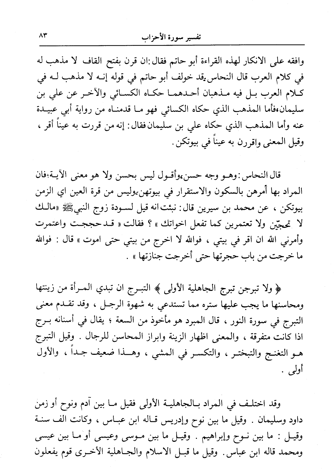 قال النحاس: وهو وجه حسن، وأقول ليس بحسن ولا هو معنى الآية، فإن المراد بها أمرهن بالسكون والاستقرار في بيوتهن، وليس من قرة العين أي الزمن بيوتكن، عن محمد بن سيرين قال: نبئت أنه قيل لسودة زوج النبي - صلى الله عليه وسلم - " مالك لا تحجين ولا تعتمرين كما تفعل أخواتك "؟ فقالت " قد حججت واعتمرت وأمرني الله أن أقر في بيتي، فوالله لا أخرج من بيتي حتى أموت " قال: فوالله ما خرجت من باب حجرتها حتى أخرجت جنازتها ".