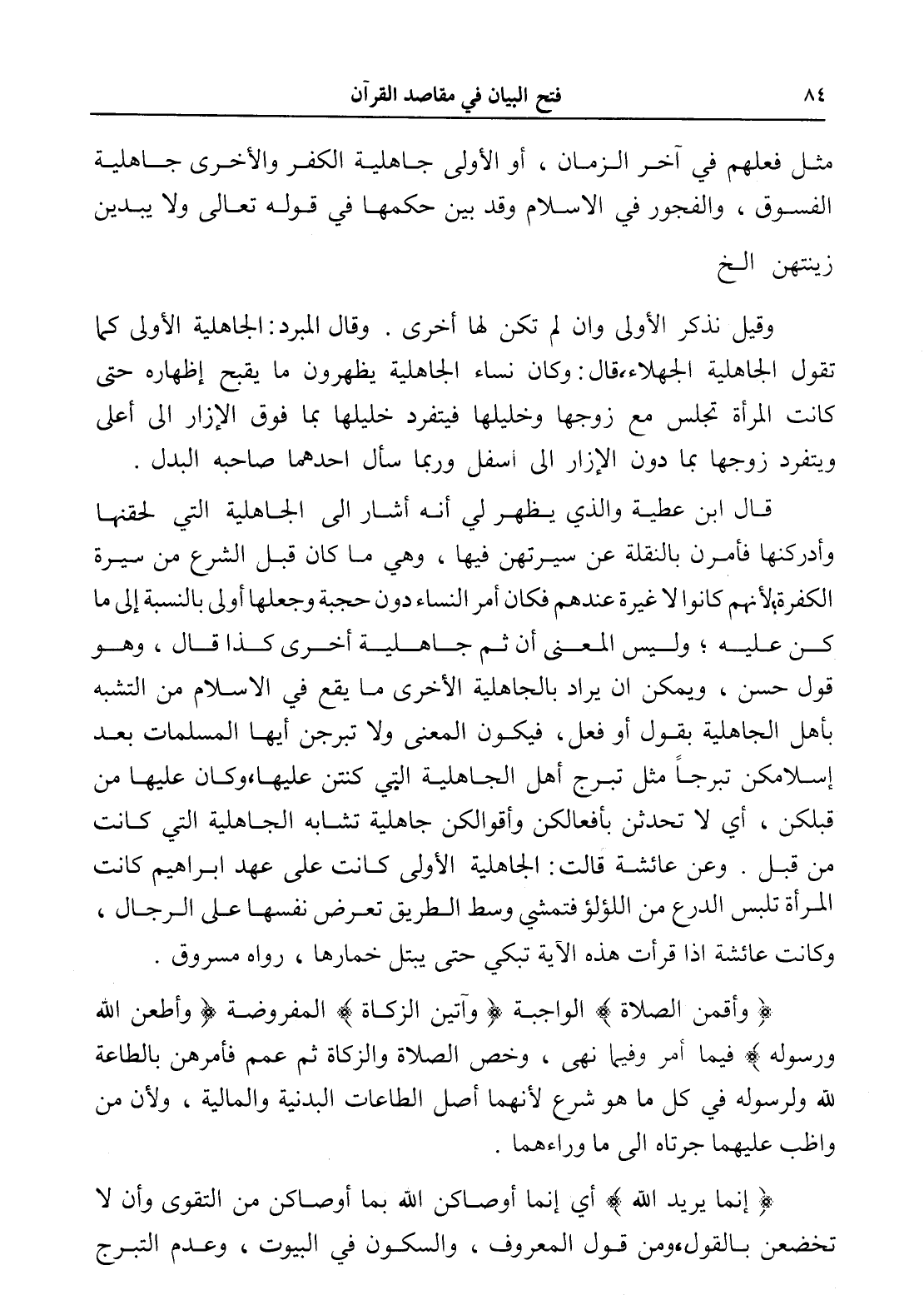 قال ابن عطية والذي يظهر لي أنه أشار إلى الجاهلية التي لحقنها وأدركنها فأمرن بالنقلة عن سيرتهن فيها، وهي ما كان قبل الشرع من سيرة الكفرة؛ لأنهم كانوا لا غيرة عندهم فكان أمر النساء دون حجبة وجعلها أولى بالنسبة إلى ما كن عليه؛ وليس المعنى أن ثم جاهلية أخرى كذا قال، وهو قول حسن، ويمكن أن يراد بالجاهلية الأخرى ما يقع في الإسلام من التشبه بأهل الجاهلية بقول أو فعل، فيكون المعنى ولا تبرجن أيها المسلمات بعد إسلامكن تبرجاً مثل تبرج أهل الجاهلية التي كنتن عليها، وكان عليها من قبلكن، أي لا تحدثن بأفعالكن وأقوالكن جاهلية تشابه الجاهلية التي كانت من قبل. وعن عائشة قالت: الجاهلية الأولى كانت على عهد إبراهيم كانت المرأة تلبس الدرع من اللؤلؤ فتمشي وسط الطريق تعرض نفسها على الرجال، وكانت عائشة إذا قرأت هذه الآية تبكي حتى يبتل خمارها، رواه مسروق.