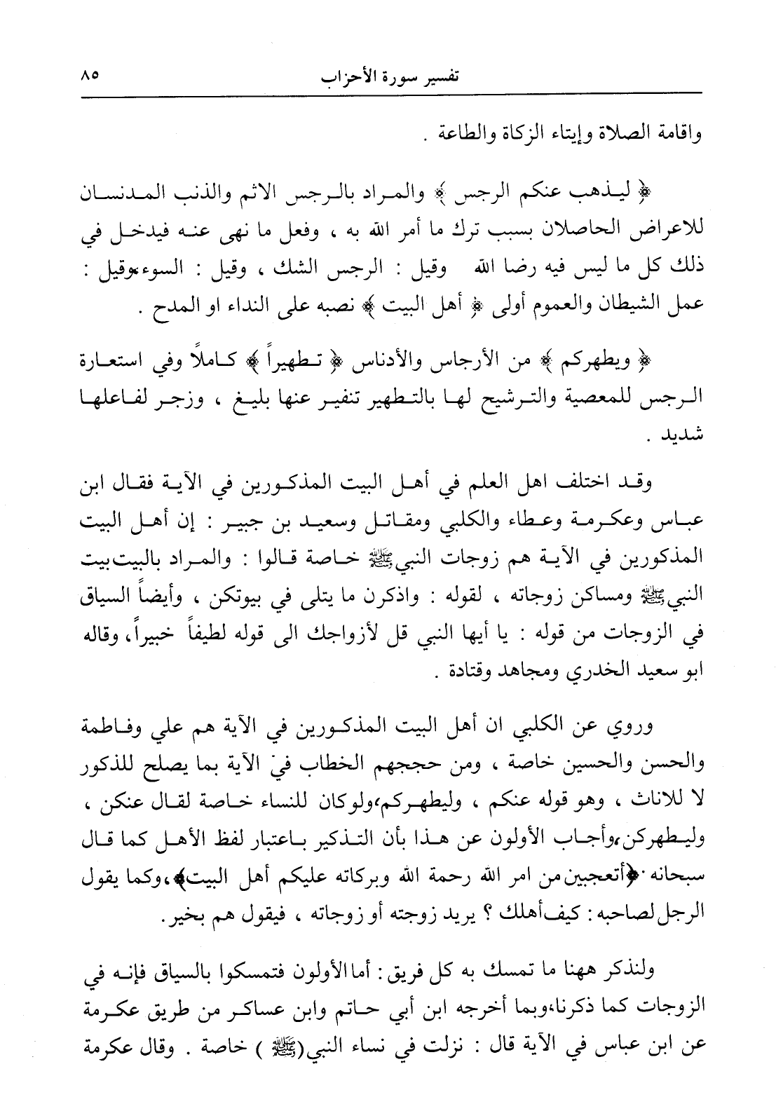 وروي عن الكلبي إن أهل البيت المذكورين في الآية هم علي وفاطمة والحسن والحسين خاصة، ومن حججهم الخطاب في الآية بما يصلح للذكور لا للإناث، وهو قوله عنكم، وليطهركم، ولو كان للنساء خاصة لقال عنكن، وليطهركن، وأجاب الأولون عن هذا بأن التذكير باعتبار لفظ الأهل كما قال سبحانه (أَتَعْجَبِينَ مِنْ أَمْرِ اللَّهِ رَحْمَتُ اللَّهِ وَبَرَكَاتُهُ عَلَيْكُمْ أَهْلَ الْبَيْتِ)، وكما يقول الرجل لصاحبه: كيف أهلك؟ يريد زوجته أو زوجاته، فيقول هم بخير.