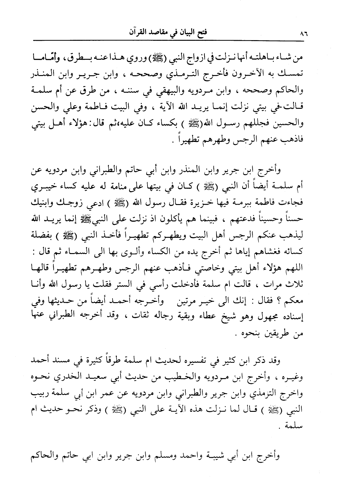 وأخرج ابن جرير وابن المنذر وابن أبي حاتم والطبراني وابن مردويه عن أم سلمة أيضاًً أن النبي (- صلى الله عليه وسلم -) كان في بيتها على منامة له عليه كساء خيبري فجاءت فاطمة ببرمة فيها خزيرة فقال رسول الله (- صلى الله عليه وسلم -) ادعي زوجك وابنيك حسناً وحسيناً فدعتهم، فبينما هم يأكلون إذ نزلت على النبي - صلى الله عليه وسلم - إنما يريد الله ليذهب عنكم الرجس أهل البيت ويطهركم تطهيراً فأخذ النبي (- صلى الله عليه وسلم -) بفضلة كسائه فغشاهم إياها ثم أخرج يده من الكساء وألوى بها إلى السماء ثم قال: اللهم هؤلاء أهل بيتي وخاصتي فأذهب عنهم الرجس وطهرهم تطهيراً قالها ثلاث مرات، قالت أم سلمة فأدخلت رأسي في الستر فقلت يا رسول الله وأنا معكم؟ فقال: إنك إلي خير مرتين وأخرجه أحمد أيضاًً من حديثها وفي إسناده مجهول وهو شيخ عطاء وبقية رجاله ثقات، وقد أخرجه الطبراني عنها من طريقين بنحوه.