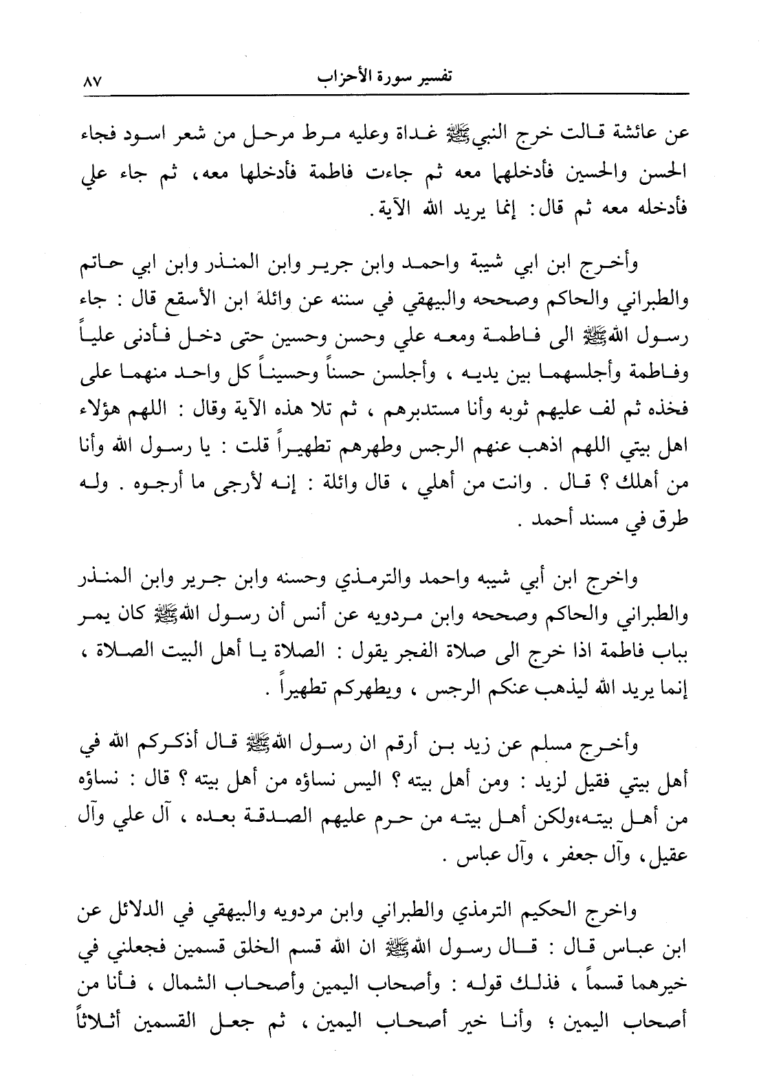 وأخرج مسلم عن زيد بن أرقم أن رسول الله - صلى الله عليه وسلم - قال أذكركم الله في أهل بيتي فقيل لزيد: ومن أهل بيته؟ أليس نساؤه من أهل بيته؟ قال: نساؤه من أهل بيته، ولكن أهل بيته من حرم عليهم الصدقة بعده، آل علي وآل عقيل، وآل جعفر، وآل عباس.