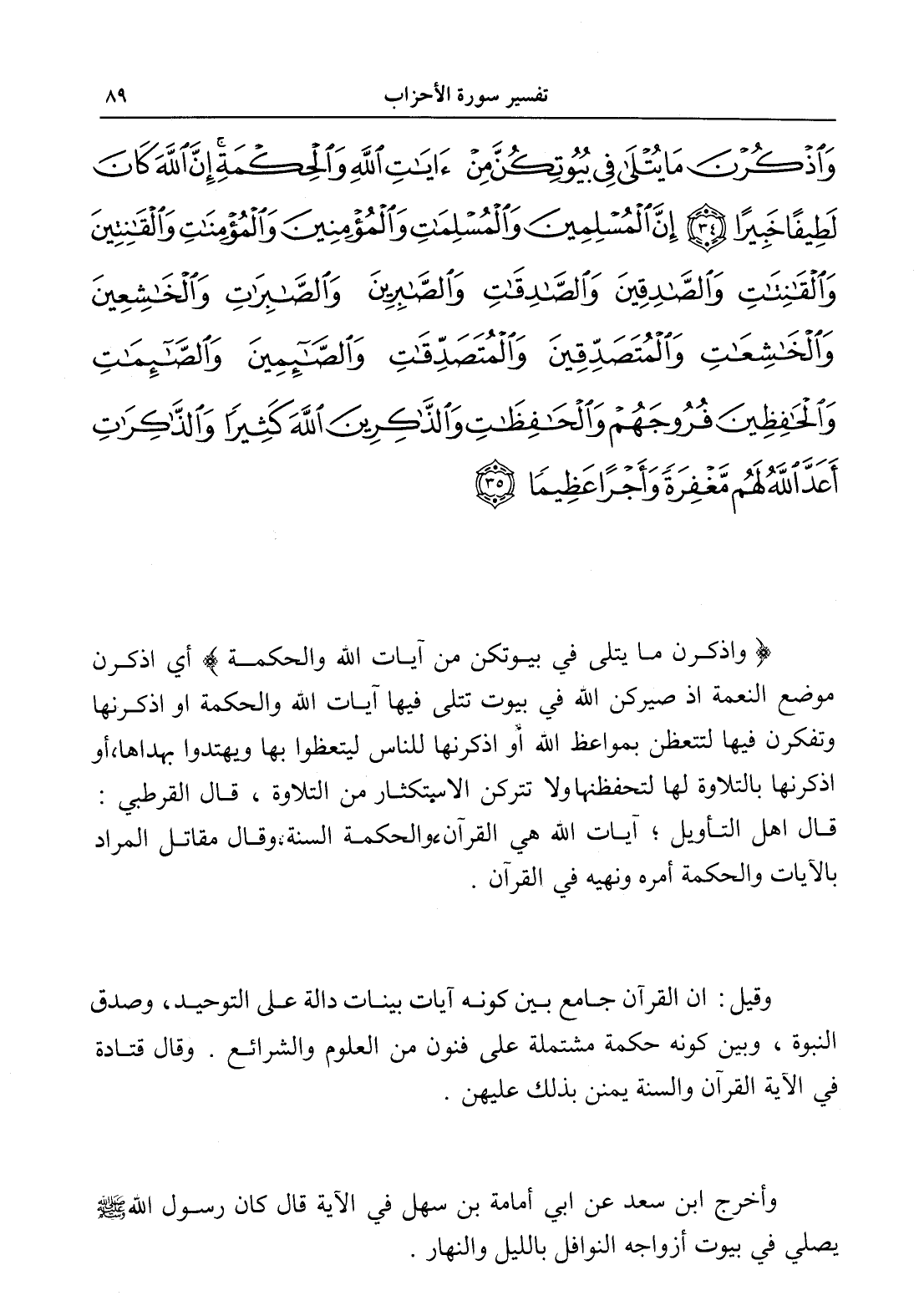 وَاذْكُرْنَ مَا يُتْلَى فِي بُيُوتِكُنَّ مِنْ آيَاتِ اللَّهِ وَالْحِكْمَةِ إِنَّ اللَّهَ كَانَ لَطِيفًا خَبِيرًا (34) إِنَّ الْمُسْلِمِينَ وَالْمُسْلِمَاتِ وَالْمُؤْمِنِينَ وَالْمُؤْمِنَاتِ وَالْقَانِتِينَ وَالْقَانِتَاتِ وَالصَّادِقِينَ وَالصَّادِقَاتِ وَالصَّابِرِينَ وَالصَّابِرَاتِ وَالْخَاشِعِينَ وَالْخَاشِعَاتِ وَالْمُتَصَدِّقِينَ وَالْمُتَصَدِّقَاتِ وَالصَّائِمِينَ وَالصَّائِمَاتِ وَالْحَافِظِينَ فُرُوجَهُمْ وَالْحَافِظَاتِ وَالذَّاكِرِينَ اللَّهَ كَثِيرًا وَالذَّاكِرَاتِ أَعَدَّ اللَّهُ لَهُمْ مَغْفِرَةً وَأَجْرًا عَظِيمًا (35)