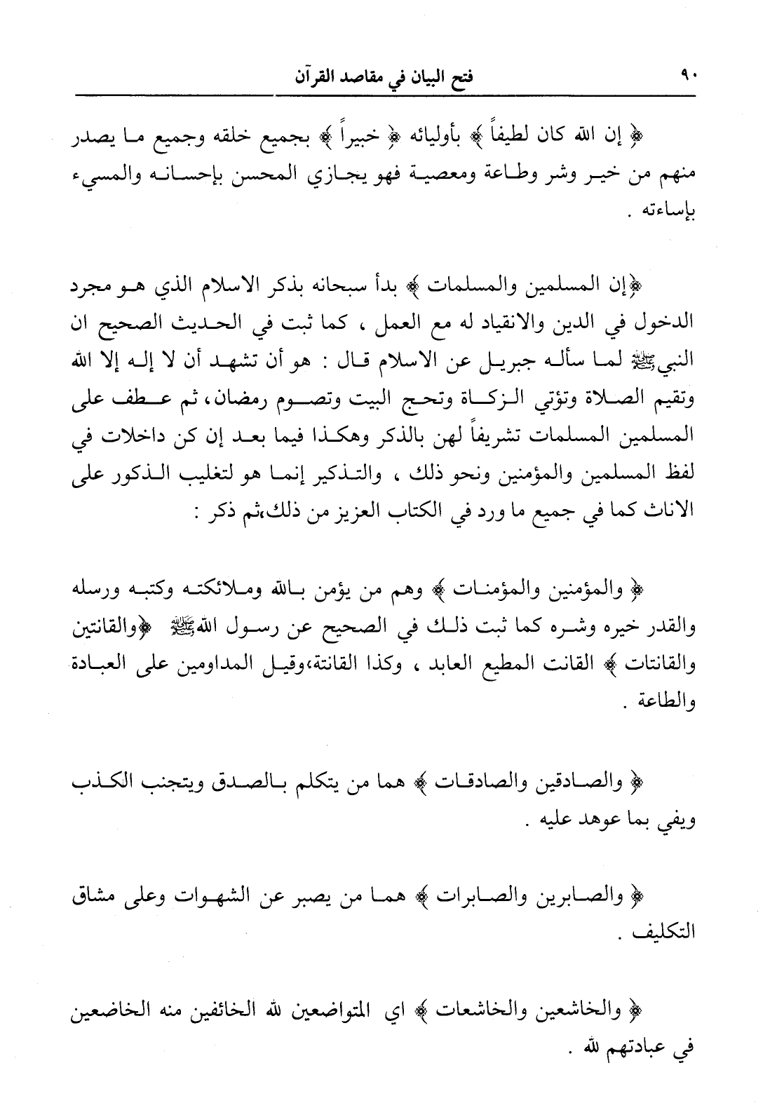 (والمؤمنين والمؤمنات) وهم من يؤمن بالله وملائكته وكتبه ورسله والقدر خيره وشره كما ثبت ذلك في الصحيح عن رسول الله - صلى الله عليه وسلم - (والقانتين والقانتات) القانت المطيع العابد، وكذا القانتة، وقيل المداومين على العبادة والطاعة.