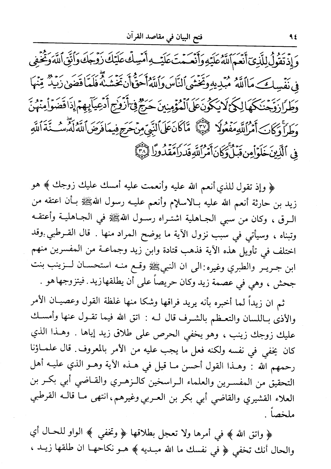 وَإِذْ تَقُولُ لِلَّذِي أَنْعَمَ اللَّهُ عَلَيْهِ وَأَنْعَمْتَ عَلَيْهِ أَمْسِكْ عَلَيْكَ زَوْجَكَ وَاتَّقِ اللَّهَ وَتُخْفِي فِي نَفْسِكَ مَا اللَّهُ مُبْدِيهِ وَتَخْشَى النَّاسَ وَاللَّهُ أَحَقُّ أَنْ تَخْشَاهُ فَلَمَّا قَضَى زَيْدٌ مِنْهَا وَطَرًا زَوَّجْنَاكَهَا لِكَيْ لَا يَكُونَ عَلَى الْمُؤْمِنِينَ حَرَجٌ فِي أَزْوَاجِ أَدْعِيَائِهِمْ إِذَا قَضَوْا مِنْهُنَّ وَطَرًا وَكَانَ أَمْرُ اللَّهِ مَفْعُولًا (37) مَا كَانَ عَلَى النَّبِيِّ مِنْ حَرَجٍ فِيمَا فَرَضَ اللَّهُ لَهُ سُنَّةَ اللَّهِ فِي الَّذِينَ خَلَوْا مِنْ قَبْلُ وَكَانَ أَمْرُ اللَّهِ قَدَرًا مَقْدُورًا (38)