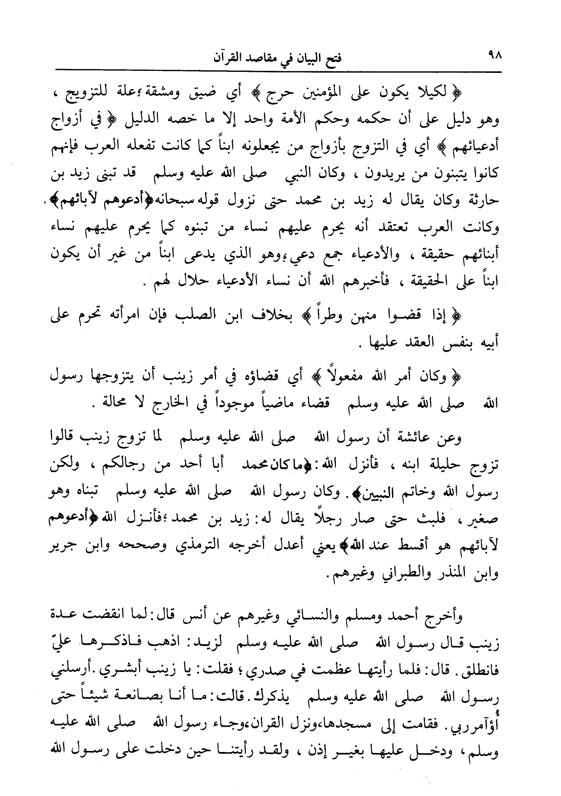 وعن عائشة أن رسول الله صلى الله عليه وسلم لما تزوج زينب قالوا تزوج حليلة ابنه، فأنزل الله: (ما كان محمد أبا أحد من رجالكم ولكن رسول الله وخاتم النبيين). وكان رسول الله صلى الله عليه وسلم تبناه وهو صغير، فلبث حتى صار رجلاً يقال له: زيد بن محمد؛ فأنزل الله (أدعوهم لآبائهم هو أقسط عند الله) يعني أعدل أخرجه الترمذي وصححه وابن جرير وابن المنذر والطبراني وغيرهم.