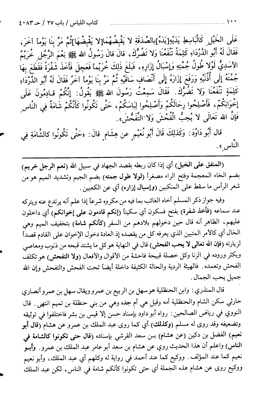 قَالَ النَّوَوِيُّ فِي رِيَاضِ الصَّالِحِينَ رَوَاهُ أَبُو دَاوُدَ بِإِسْنَادٍ حَسَنٍ إِلَّا قَيْسَ بْنَ بِشْرٍ فَاخْتَلَفُوا فِي تَوْثِيقِهِ وَتَضْعِيفِهِ وَقَدْ رَوَى لَهُ مُسْلِمٌ (وَكَذَلِكَ) أَيْ كَمَا رَوَى عَبْدُ الْمَلِكِ بن عمر وعن هِشَامِ (قَالَ أَبُو نُعَيْمٍ) الْفَضْلُ بْنُ دُكَيْنٍ عَنْ هِشَامِ بْنِ سَعْدٍ الْقُرَشِيِّ بِإِسْنَادِهِ (قَالَ حَتَّى تَكُونُوا كَالشَّامَةِ فِي النَّاسِ) وَاعْلَمْ أَنَّ هذا الحديث روي عَنْ هِشَامِ بْنِ سَعْدٍ أَبُو عَامِرٍ عَبْدُ الْمَلِكِ بْنُ عَمْرٍو
