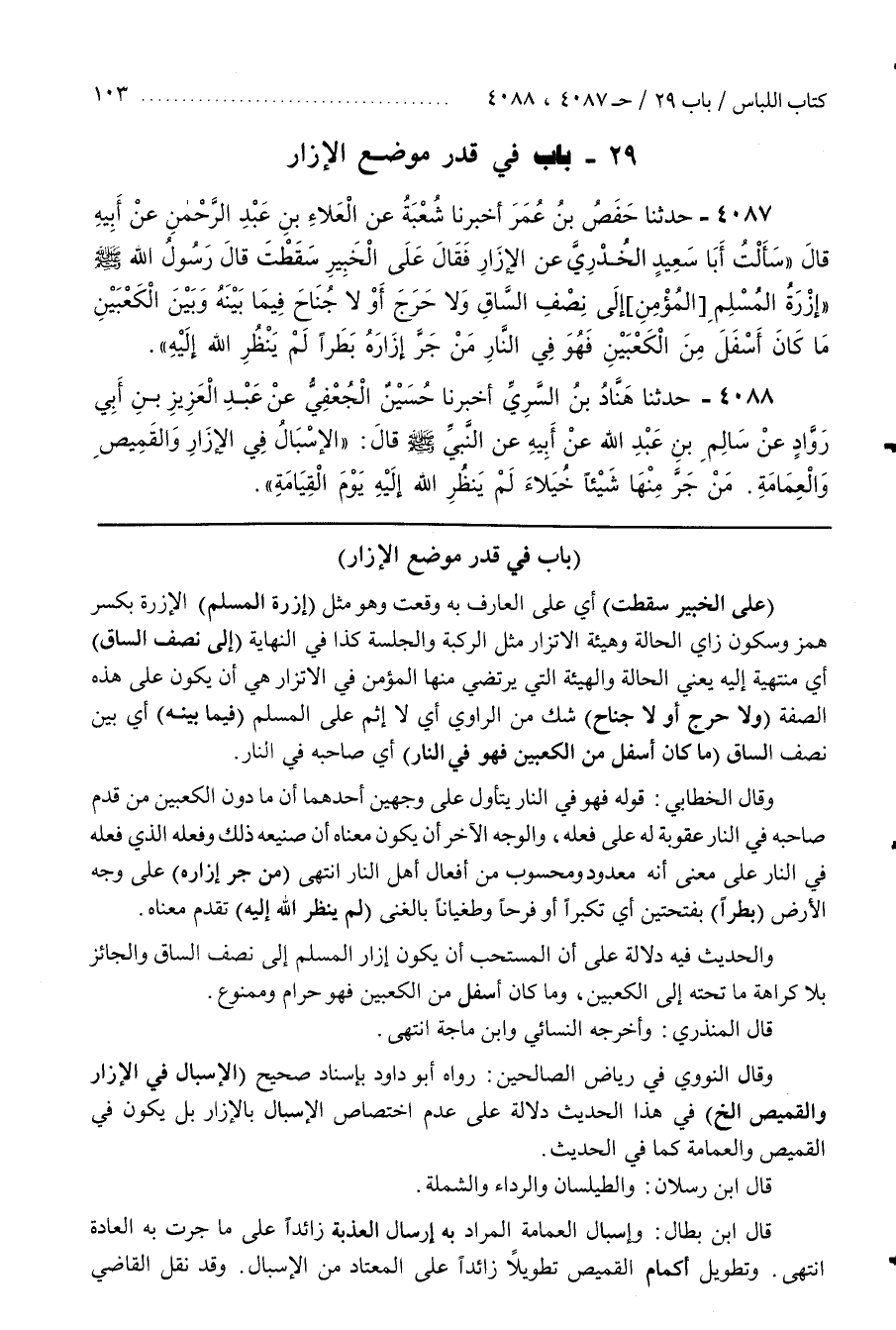 وَالْحَدِيثُ فِيهِ دَلَالَةٌ عَلَى أَنَّ الْمُسْتَحَبَّ أَنْ يَكُونَ إِزَارُ الْمُسْلِمِ إِلَى نِصْفِ السَّاقِ وَالْجَائِزُ بِلَا كَرَاهَةٍ مَا تَحْتَهُ إِلَى الْكَعْبَيْنِ وَمَا كَانَ أَسْفَلُ مِنَ الْكَعْبَيْنِ فَهُوَ حَرَامٌ وممنوع