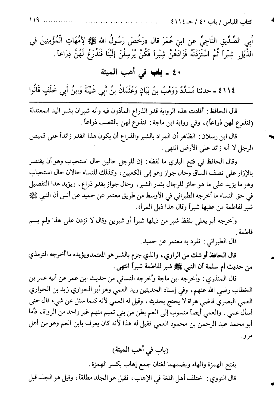 وَقَالَ الْحَافِظُ فِي فَتْحِ الْبَارِي مَا لَفْظُهُ إِنَّ لِلرِّجَالِ حَالَيْنِ حَالَ اسْتِحْبَابٍ وَهُوَ أَنْ يَقْتَصِرَ بِالْإِزَارِ عَلَى نِصْفِ السَّاقِ وَحَالَ جَوَازٍ وَهُوَ إِلَى الْكَعْبَيْنِ وَكَذَلِكَ لِلنِّسَاءِ حَالَانِ حَالُ اسْتِحْبَابٍ وَهُوَ مَا يَزِيدُ عَلَى مَا هُوَ جَائِزٌ لِلرِّجَالِ بِقَدْرِ الشِّبْرِ وَحَالُ جَوَازٍ بِقَدْرِ ذِرَاعٍ وَيُؤَيِّدُ هَذَا التَّفْصِيلَ فِي حَقِّ النِّسَاءِ مَا أَخْرَجَهُ الطَّبَرَانِيُّ فِي الْأَوْسَطِ مِنْ طَرِيقِ مُعْتَمِرٍ عَنْ حُمَيْدٍ عَنْ أَنَسٍ أَنَّ النَّبِيَّ صَلَّى اللَّهُ عَلَيْهِ وَسَلَّمَ شَبَّرَ لِفَاطِمَةَ مِنْ عَقِبِهَا شِبْرًا وَقَالَ هَذَا ذَيْلُ الْمَرْأَةِ