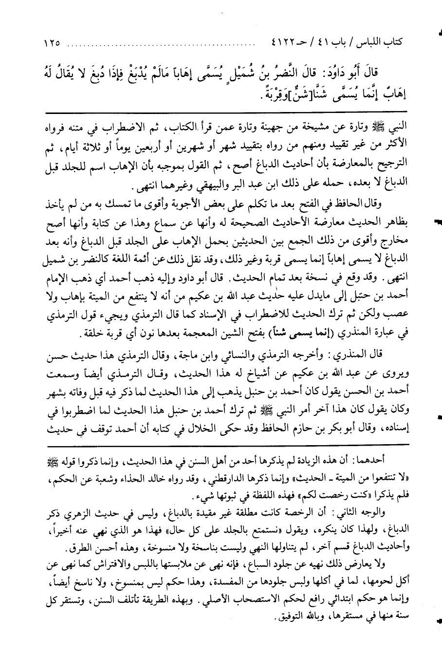 قَالَ أَبُو دَاوُدَ وَإِلَيْهِ ذَهَبَ أَحْمَدُ أَيْ ذَهَبَ الْإِمَامُ أَحْمَدُ بْنُ حَنْبَلٍ إِلَى مَا يَدُلُّ عَلَيْهِ حَدِيثُ عَبْدِ اللَّهِ بْنِ عُكَيْمٍ مِنْ أَنَّهُ لَا يُنْتَفَعُ مِنَ الميتة بإهاب ولا عصب ولكن ثم تَرَكَ الْحَدِيثَ لِلِاضْطِرَابِ فِي الْإِسْنَادِ كَمَا قَالَ التِّرْمِذِيُّ وَيَجِيءُ قَوْلُ التِّرْمِذِيِّ فِي عِبَارَةِ الْمُنْذِرِيِّ (إِنَّمَا يُسَمَّى شَنًّا) بِفَتْحِ الشِّينِ الْمُعْجَمَةِ بَعْدَهَا نُونٌ أَيْ قِرْبَةً خَلِقَةً