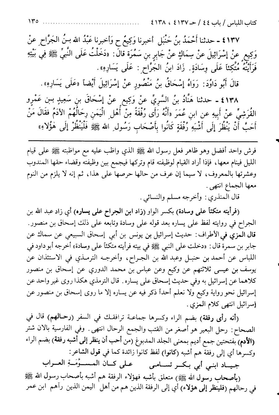 [4143] (فَرَأَيْتُهُ مُتَّكِئًا عَلَى وِسَادَةٍ) بِكَسْرِ الْوَاوِ (زَادَ بن الْجَرَّاحِ عَلَى يَسَارِهِ أَيْ) زَادَ عَبْدُ اللَّهِ بْنُ الْجَرَّاحِ فِي رِوَايَتِهِ لَفْظَ عَلَى يَسَارِهِ بَعْدَ قَوْلِهِ عَلَى وِسَادَةٍ وَتَابَعَهُ عَلَى ذَلِكَ إِسْحَاقُ بْنُ مَنْصُورٍ