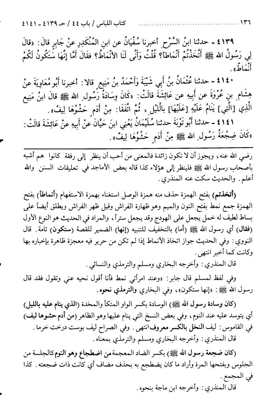 [4145] (أَتَّخَذْتُمْ) بِفَتْحِ الْهَمْزَةِ حَذَفَ مِنْهُ هَمْزَةَ الْوَصْلِ اسْتِغْنَاءً بِهَمْزَةِ الِاسْتِفْهَامِ (أَنْمَاطًا) بِفَتْحِ الْهَمْزَةِ جَمْعُ نَمَطٍ بِفَتْحِ النُّونِ وَالْمِيمِ وَهُوَ ظِهَارَةُ الْفِرَاشِ وَقِيلَ ظَهْرُ الْفِرَاشِ وَيُطْلَقُ أَيْضًا عَلَى بِسَاطٍ لَطِيفٍ لَهُ خَمْلٌ يُجْعَلُ عَلَى الْهَوْدَجِ وَقَدْ يُجْعَلُ سِتْرًا وَالْمُرَادُ فِي الْحَدِيثِ هُوَ النَّوْعُ الْأَوَّلُ (فَقَالَ) أَيْ رَسُولُ اللَّهِ صَلَّى اللَّهُ عَلَيْهِ وَسَلَّمَ (أَمَا) بِالتَّخْفِيفِ لِلتَّنْبِيهِ (إِنَّهَا) الضَّمِيرُ لِلْقِصَّةِ (سَتَكُونُ) تَامَّةٌ