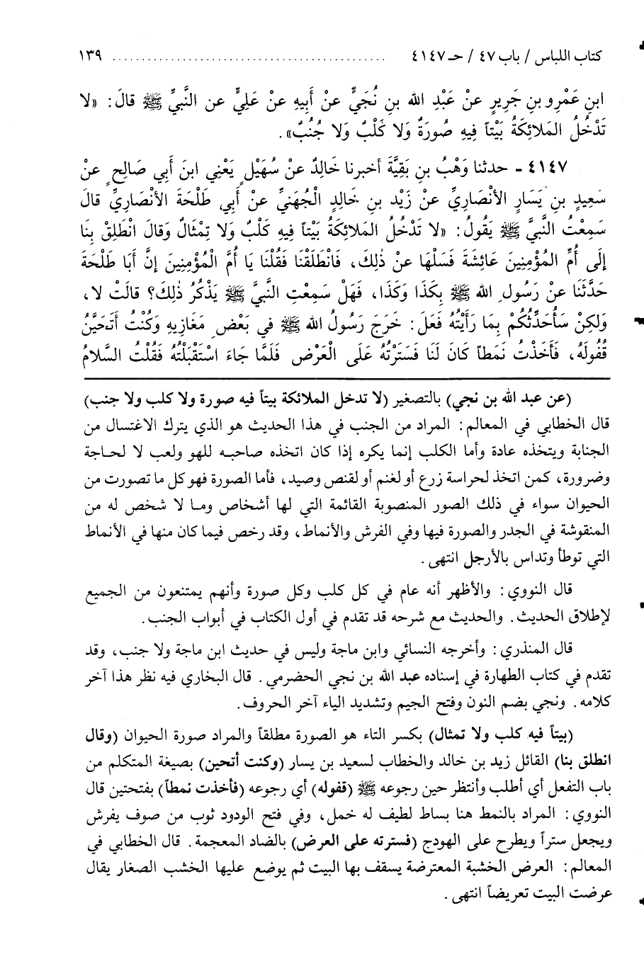 [4152] (عَنْ عَبْدِ اللَّهِ بْنِ نُجَيٍّ) بِالتَّصْغِيرِ (لَا تَدْخُلُ الْمَلَائِكَةُ بَيْتًا فِيهِ صُورَةٌ وَلَا كَلْبٌ وَلَا جُنُبٌ) قَالَ الْخَطَّابِيُّ فِي الْمَعَالِمِ الْمُرَادُ مِنَ الْجُنُبِ فِي هَذَا الْحَدِيثِ هُوَ الَّذِي يَتْرُكُ الِاغْتِسَالَ مِنَ الْجَنَابَةِ وَيَتَّخِذُهُ عَادَةً وَأَمَّا الْكَلْبُ إِنَّمَا يُكْرَهُ إِذَا كَانَ اتَّخَذَهُ صَاحِبُهُ للهو ولعب لا لحاجة وضرورة كمن اتخذ لِحِرَاسَةِ زَرْعٍ أَوْ لِغَنَمٍ أَوْ لِقَنْصٍ وَصَيْدٍ فَأَمَّا الصُّورَةُ فَهُوَ كُلُّ مَا تَصَوَّرَتْ مِنَ الْحَيَوَانِ سَوَاءٌ فِي ذَلِكَ الصُّوَرُ الْمَنْصُوبَةُ الْقَائِمَةُ الَّتِي لَهَا أَشْخَاصٌ وَمَا لَا شَخْصَ لَهُ مِنَ الْمَنْقُوشَةِ فِي الْجُدُرِ وَالصُّورَةُ فِيهَا وَفِي الْفُرُشِ وَالْأَنْمَاطِ وَقَدْ رُخِّصَ فِيمَا كَانَ مِنْهَا فِي الْأَنْمَاطِ الَّتِي تُوطَأُ وَتُدَاسُ بِالْأَرْجُلِ انْتَهَى