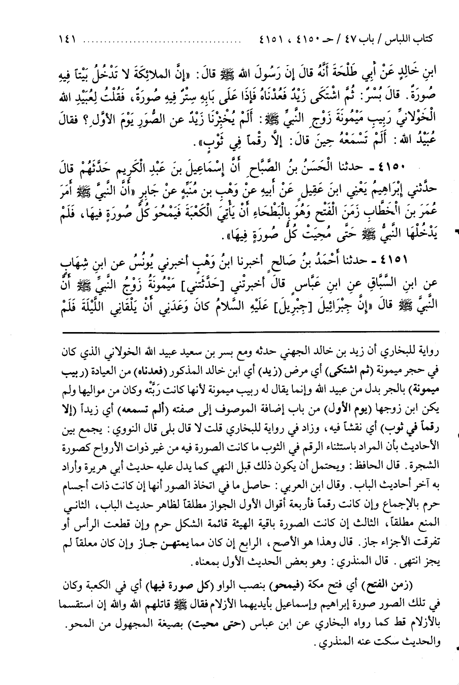 رِوَايَةٍ لِلْبُخَارِيِّ أَنَّ زَيْدَ بْنَ خَالِدٍ الْجُهَنِيَّ حَدَّثَهُ وَمَعَ بُسْرِ بْنِ سَعِيدٍ عُبَيْدُ اللَّهِ الْخَوْلَانِيُّ الَّذِي كَانَ فِي حِجْرِ مَيْمُونَةَ (ثُمَّ اشتكى) أي مرض (زيد) أي بن خَالِدٍ الْمَذْكُورُ (فَعُدْنَاهُ) مِنَ الْعِيَادَةِ (رَبِيبِ مَيْمُونَةَ) بِالْجَرِّ بَدَلٌ مِنْ عُبَيْدِ اللَّهِ وَإِنَّمَا يُقَالُ لَهُ رَبِيبُ مَيْمُونَةَ لِأَنَّهَا كَانَتْ رَبَّتْهُ وَكَانَ مِنْ مَوَالِيهَا وَلَمْ يَكُنِ ابْنَ زَوْجِهَا (يَوْمَ الْأَوَّلِ) مِنْ بَابِ إِضَافَةِ الْمَوْصُوفِ إِلَى صِفَتِهِ (أَلَمْ تَسْمَعْهُ) أَيْ زَيْدًا (إِلَّا رَقْمًا فِي ثَوْبٍ) أَيْ نَقْشًا فِيهِ وَزَادَ فِي رِوَايَةٍ لِلْبُخَارِيِّ قُلْتُ لَا قَالَ بَلَى قَالَ النَّوَوِيُّ يُجْمَعُ بَيْنَ الْأَحَادِيثِ بِأَنَّ الْمُرَادَ بِاسْتِثْنَاءِ الرَّقْمِ فِي الثَّوْبِ مَا كَانَتِ الصُّورَةُ فِيهِ مِنْ غَيْرِ ذَوَاتِ الْأَرْوَاحِ كَصُورَةِ الشَّجَرَةِ