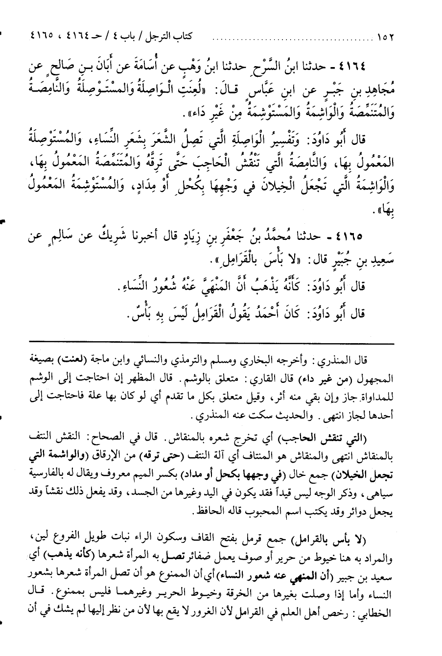 [4171] (لَا بَأْسَ بِالْقَرَامِلِ) جَمْعُ قَرْمَلٍ بِفَتْحِ الْقَافِ وَسُكُونِ الرَّاءِ نَبَاتٌ طَوِيلُ الْفُرُوعِ لَيِّنٌ وَالْمُرَادُ بِهِ هُنَا خُيُوطٌ مِنْ حَرِيرٍ أَوْ صُوفٍ يُعْمَلُ ضَفَائِرُ تَصِلُ بِهِ الْمَرْأَةُ شَعْرَهَا (كَأَنَّهُ يَذْهَبُ) أَيْ سَعِيدُ بْنُ جُبَيْرٍ (أَنَّ الْمَنْهِيَّ عَنْهُ شُعُورُ النِّسَاءِ) أَيْ أَنَّ الْمَمْنُوعَ هُوَ أَنْ تَصِلَ الْمَرْأَةُ شَعْرَهَا بِشُعُورِ النِّسَاءِ وَأَمَّا إِذَا وَصَلَتْ بِغَيْرِهَا مِنَ الْخِرْقَةِ وَخُيُوطِ الْحَرِيرِ وَغَيْرِهِمَا فَلَيْسَ بِمَمْنُوعٍ
