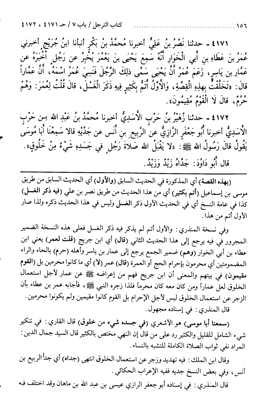 [4178] (سَمِعْنَا أَبَا مُوسَى) هُوَ الْأَشْعَرِيُّ (فِي جَسَدِهِ شيء من خلوق) قال القارىء فِي تَنْكِيرِ شَيْءٍ الشَّامِلِ لِلْقَلِيلِ وَالْكَثِيرِ رَدٌّ عَلَى مَنْ قَالَ إِنَّ النَّهْيَ مُخْتَصٌّ بِالْكَثِيرِ قَالَ السَّيِّدُ جَمَالُ الدِّينِ الْمُرَادُ نَفْيُ ثَوَابِ الصلاة الكاملة للتشبه بالنساء