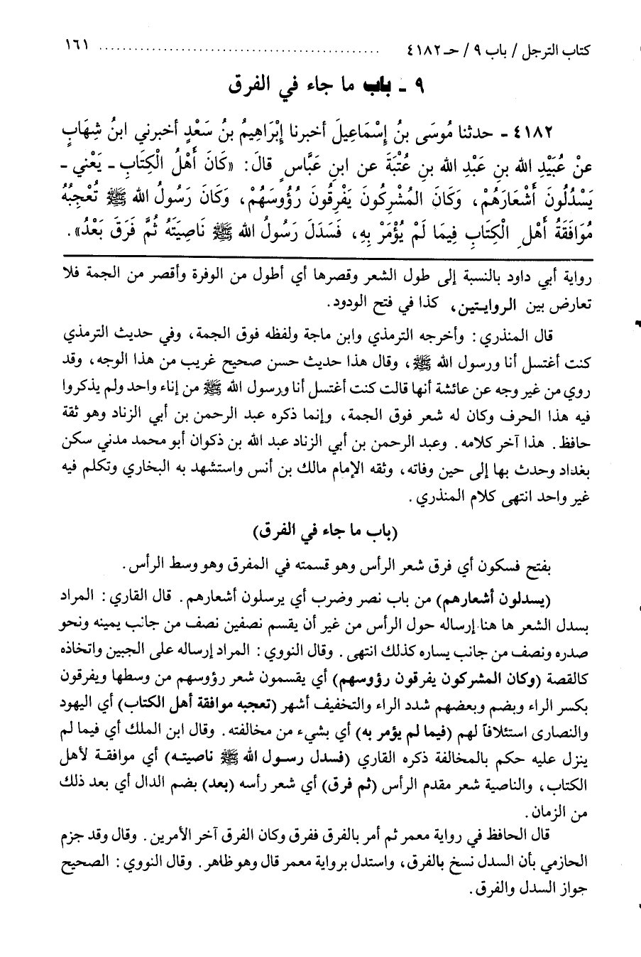 وقال بن الْمَلَكِ أَيْ فِيمَا لَمْ يَنْزِلْ عَلَيْهِ حُكْمٌ بالمخالفة ذكره القارىء (فَسَدَلَ رَسُولُ اللَّهِ صَلَّى اللَّهُ عَلَيْهِ وَسَلَّمَ نَاصِيَتَهُ) أَيْ مُوَافَقَةً لِأَهْلِ الْكِتَابِ وَالنَّاصِيَةُ شَعْرُ مُقَدَّمِ الرَّأْسِ ثُمَّ فَرَقَ) أَيْ شَعْرَ رَأْسِهِ (بَعْدُ) بِضَمِّ الدَّالِ أَيْ بَعْدَ ذَلِكَ مِنِ الزَّمَانِ