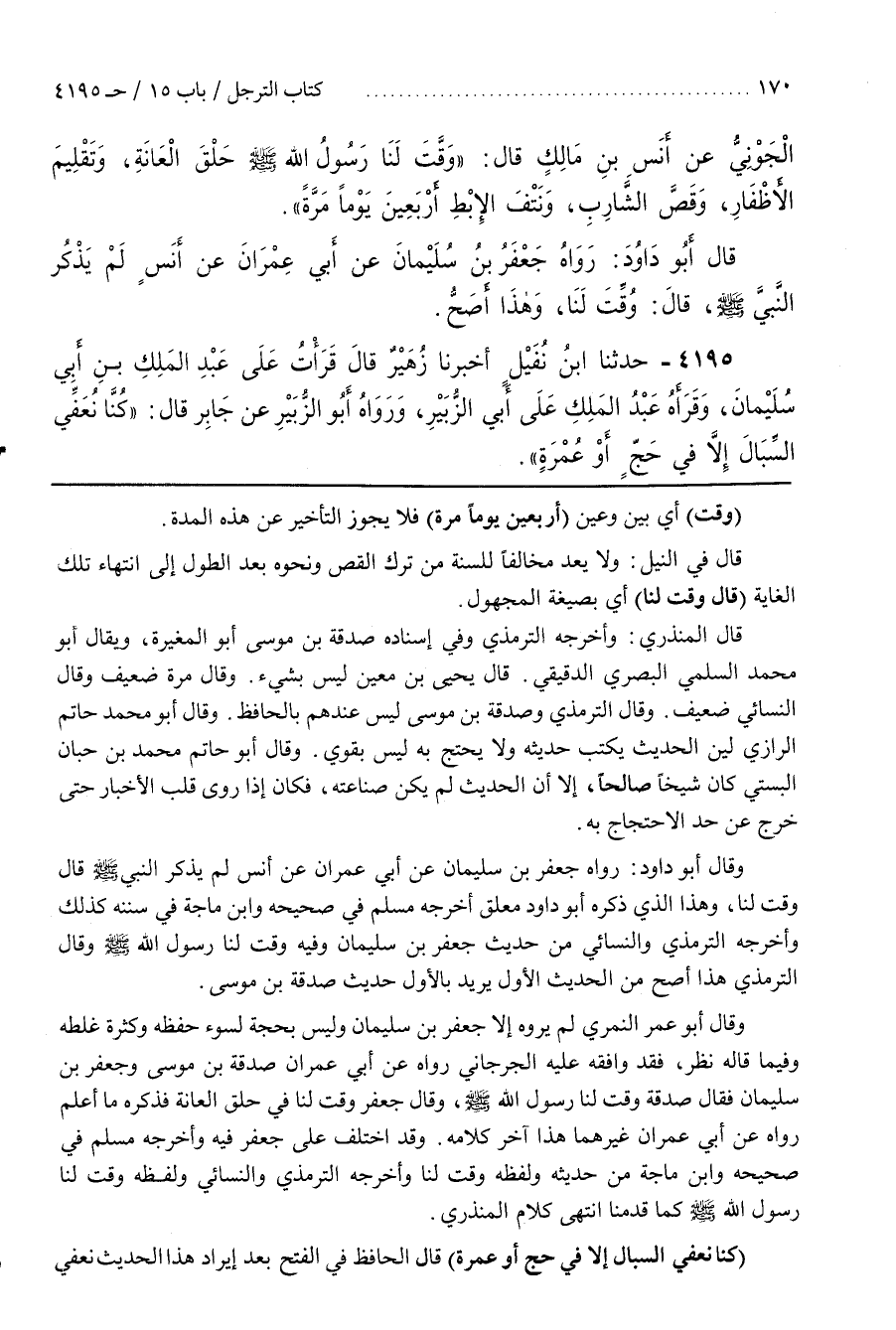 وَقَالَ أَبُو دَاوُدَ رَوَاهُ جَعْفَرُ بْنُ سُلَيْمَانَ عَنْ أَبِي عِمْرَانَ عَنْ أَنَسٍ لَمْ يَذْكُرِ النَّبِيَّ صَلَّى اللَّهُ عَلَيْهِ وَسَلَّمَ قَالَ وُقِّتَ لَنَا وَهَذَا الَّذِي ذَكَرَهُ أَبُو دَاوُدَ مُعَلَّقٌ أخرجه مسلم في صحيحه وبن مَاجَهْ فِي سُنَنِهِ كَذَلِكَ وَأَخْرَجَهُ التِّرْمِذِيُّ وَالنَّسَائِيُّ مِنْ حَدِيثِ جَعْفَرِ بْنِ سُلَيْمَانَ وَفِيهِ وَقَّتَ لَنَا رَسُولِ اللَّهِ صَلَّى اللَّهُ عَلَيْهِ وَسَلَّمَ وَقَالَ التِّرْمِذِيُّ هَذَا أَصَحُّ مِنَ الْحَدِيثِ الْأَوَّلِ يُرِيدُ بِالْأَوَّلِ حَدِيثَ صَدَقَةَ بْنِ مُوسَى