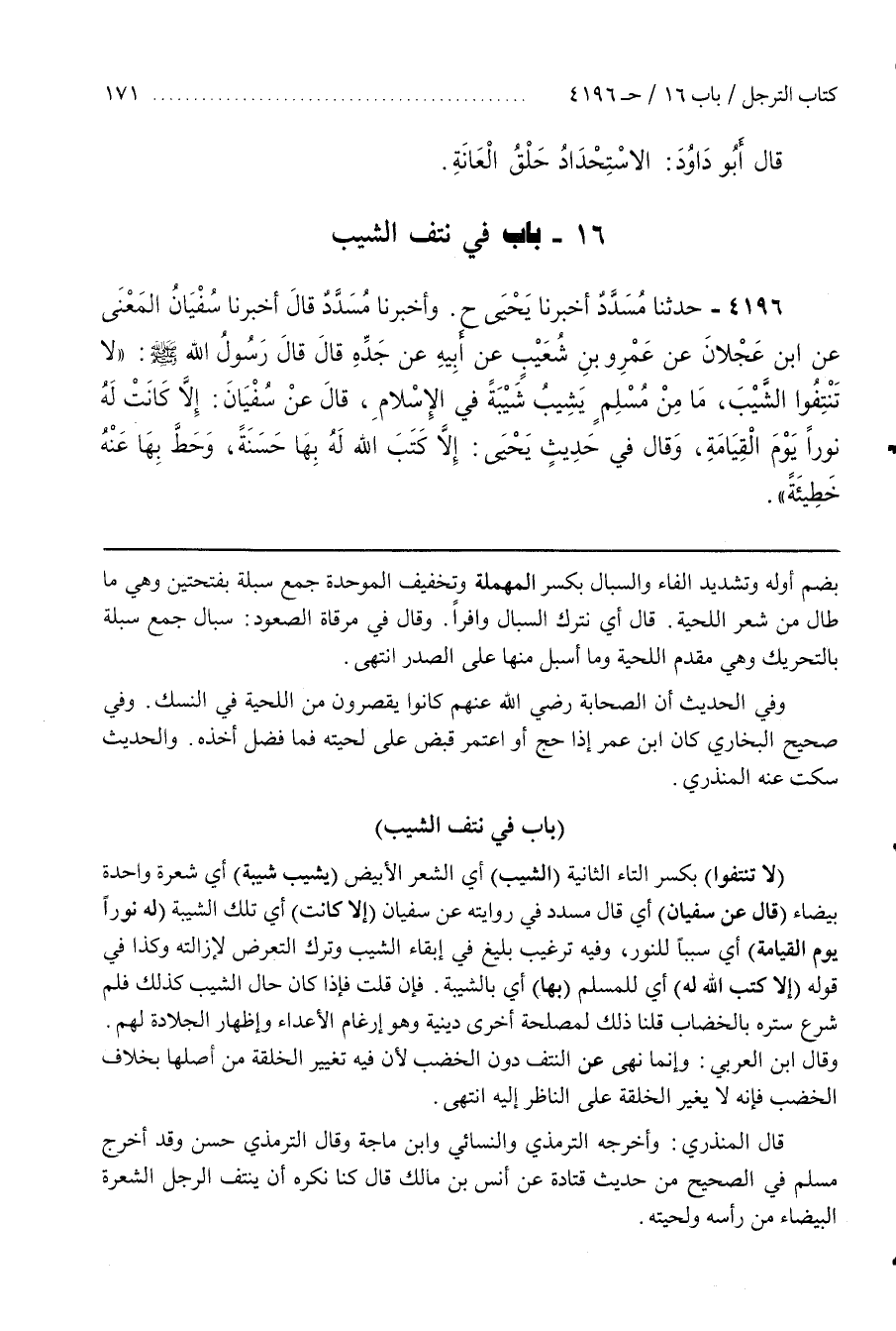 قَالَ الْمُنْذِرِيُّ وَأَخْرَجَهُ التِّرْمِذِيُّ وَالنَّسَائِيُّ وبن مَاجَهْ وَقَالَ التِّرْمِذِيُّ حَسَنٌ وَقَدْ أَخْرَجَ مُسْلِمٌ فِي الصَّحِيحِ مِنْ حَدِيثِ قَتَادَةَ عَنْ أَنَسِ بْنِ مَالِكٍ قَالَ كُنَّا نَكْرَهُ أَنْ يَنْتِفَ الرَّجُلُ الشَّعْرَةَ الْبَيْضَاءَ مِنْ رَأْسِهِ وَلِحْيَتِهِ