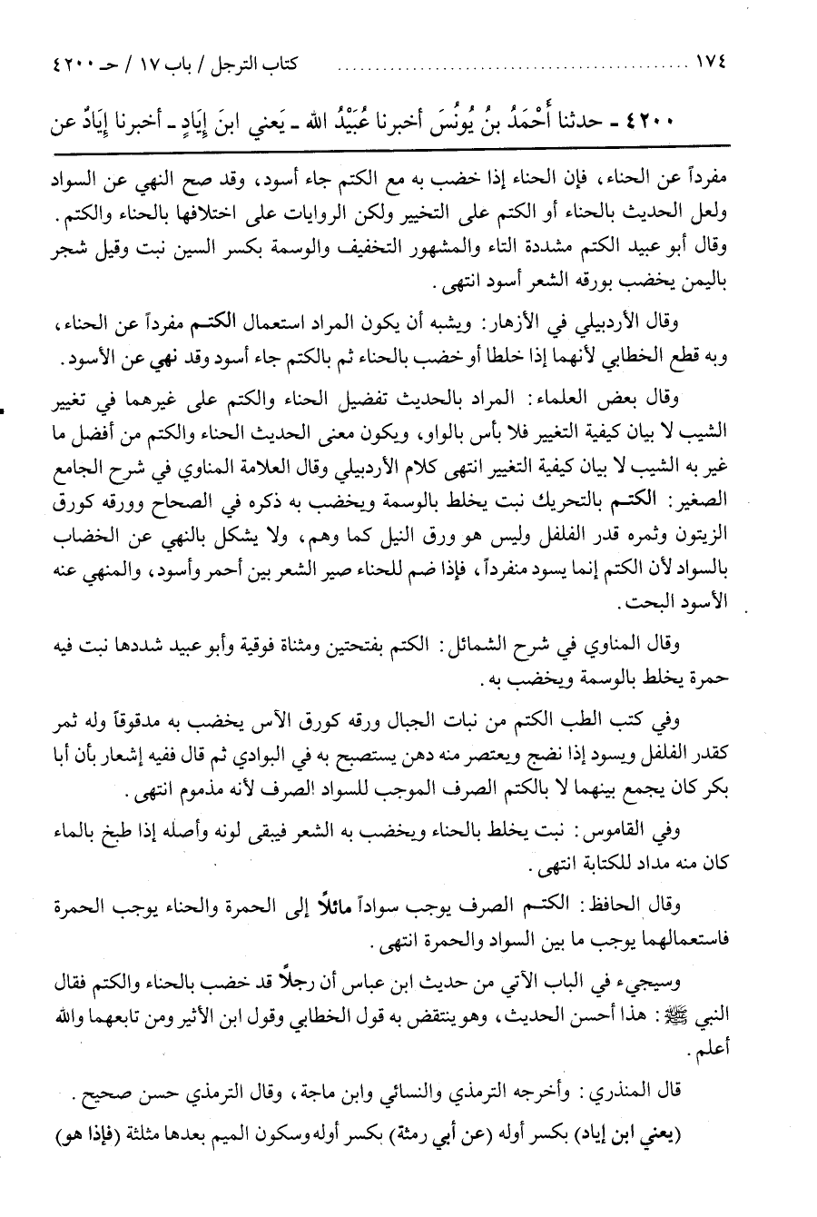 وقال بعض العلماء بالمراد بِالْحَدِيثِ تَفْضِيلُ الْحِنَّاءِ وَالْكَتَمِ عَلَى غَيْرِهِمَا فِي تَغْيِيرِ الشَّيْبِ لَا بَيَانُ كَيْفِيَّةِ التَّغْيِيرِ فَلَا بَأْسَ بِالْوَاوِ وَيَكُونُ مَعْنَى الْحَدِيثِ الْحِنَّاءُ وَالْكَتَمُ مِنْ أَفْضَلِ مَا غُيِّرَ بِهِ الشَّيْبُ لَا بَيَانَ كَيْفِيَّةِ التَّغْيِيرِ انْتَهَى كَلَامُ الْأَرْدَبِيلِيِّ وَقَالَ الْعَلَّامَةُ الْمُنَاوِيُّ فِي شَرْحِ الْجَامِعِ الصَّغِيرِ الْكَتَمُ بِالتَّحْرِيكِ نَبْتٌ يُخْلَطُ بِالْوَسِمَةِ وَيُخْضَبُ بِهِ ذَكَرَهُ فِي الصِّحَاحِ وَوَرَقُهُ كَوَرَقِ الزَّيْتُونِ وَثَمَرُهُ قَدْرُ الْفُلْفُلِ وَلَيْسَ هُوَ وَرَقُ النِّيلِ كَمَا وُهِمَ وَلَا يُشْكِلُ بِالنَّهْيِ عَنِ الْخِضابِ بِالسَّوَادِ لِأَنَّ الْكَتَمَ إِنَّمَا يُسَوِّدُ مُنْفَرِدًا فَإِذَا ضُمَّ لِلْحِنَّاءِ صَيَّرَ الشَّعْرَ بَيْنَ أَحْمَرَ وَأَسْوَدَ وَالْمَنْهِيُّ عَنْهُ الْأَسْوَدُ الْبَحْتُ