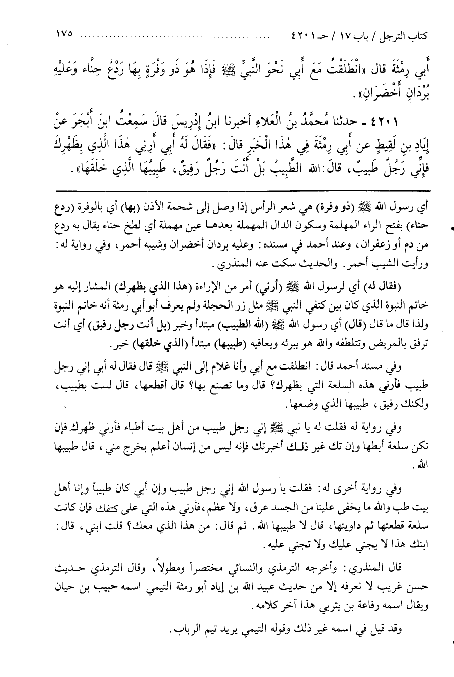 [4207] (فَقَالَ لَهُ) أَيْ لِرَسُولِ اللَّهِ صَلَّى اللَّهُ عَلَيْهِ وَسَلَّمَ (أَرِنِي) أمر من الإراءة (هذا الذي بظهرك) المشارك إِلَيْهِ هُوَ خَاتَمُ النُّبُوَّةِ الَّذِي كَانَ بَيْنَ كَتِفَيِ النَّبِيِّ صَلَّى اللَّهُ عَلَيْهِ وَسَلَّمَ مِثْلَ زِرِّ الْحَجَلَةِ وَلَمْ يَعْرِفْ أَبُو أَبِي رِمْثَةَ أَنَّهُ خَاتَمُ النُّبُوَّةِ وَلِذَا قَالَ مَا قَالَ (قَالَ) أَيْ رَسُولُ اللَّهِ صَلَّى اللَّهُ عَلَيْهِ وَسَلَّمَ (اللَّهُ الطَّبِيبُ) مُبْتَدَأٌ وَخَبَرٌ (بَلْ أَنْتَ رَجُلٌ رَفِيقٌ) أَيْ أَنْتَ تُرْفِقُ بِالْمَرِيضِ وَتَتَلَطَّفُهُ وَاللَّهُ هُوَ يُبْرِئُهُ وَيُعَافِيهُ (طَبِيبُهَا) مُبْتَدَأٌ (الَّذِي خَلَقَهَا) خَبَرٌ