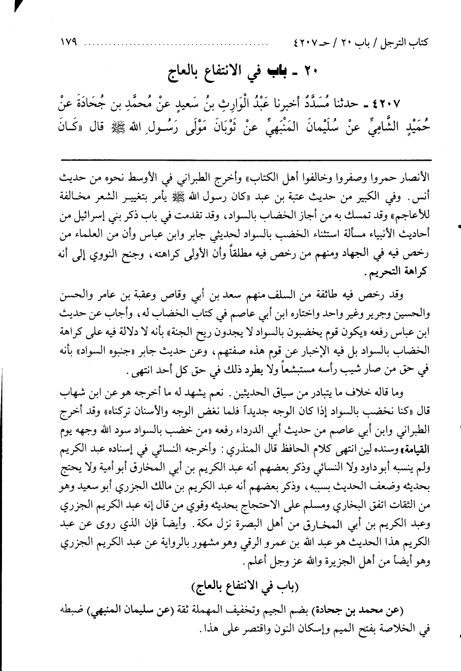 وَفِي الْكَبِيرِ مِنْ حَدِيثِ عُتْبَةَ بْنِ عَبْدٍ كَانَ رَسُولُ اللَّهِ صَلَّى اللَّهُ عَلَيْهِ وَسَلَّمَ يَأْمُرُ بِتَغْيِيرِ الشَّعْرِ مُخَالَفَةً لِلْأَعَاجِمِ وَقَدْ تَمَسَّكَ بِهِ مَنْ أَجَازَ الْخِضَابَ بِالسَّوَادِ وَقَدْ تَقَدَّمَتْ فِي بَابِ ذِكْرِ بَنِي إِسْرَائِيلَ مِنْ أَحَادِيثِ الْأَنْبِيَاءِ مَسْأَلَةُ اسْتِثْنَاءِ الْخَضْبِ بِالسَّوَادِ لِحَدِيثَيْ جَابِرٍ وبن عَبَّاسٍ وَأَنَّ مِنَ الْعُلَمَاءِ مَنْ رَخَّصَ فِيهِ فِي الْجِهَادِ وَمِنْهُمْ مَنْ رَخَّصَ فِيهِ مُطْلَقًا وَأَنَّ الْأَوْلَى كَرَاهَتُهُ وَجَنَحَ النَّوَوِيُّ إِلَى أَنَّهُ كَرَاهَةُ تَحْرِيمٍ