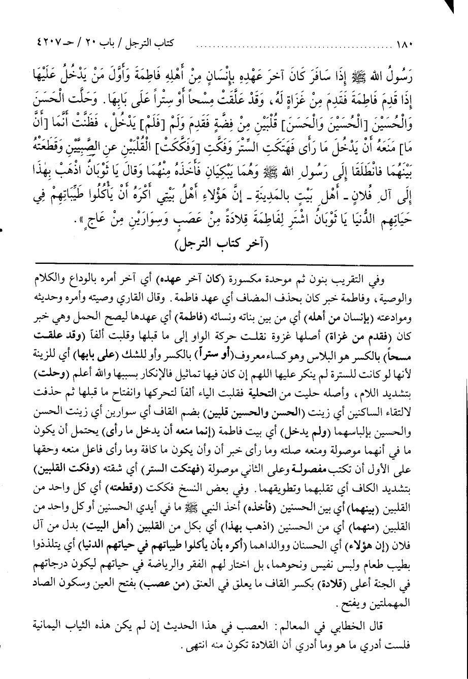 وقال القارىء وَصِيَّتُهُ وَأَمْرُهُ وَحَدِيثُهُ وَمُوَادَعَتُهُ (بِإِنْسَانٍ مِنْ أَهْلِهِ) أَيْ مِنْ بَيْنِ بَنَاتِهِ وَنِسَائِهِ (فَاطِمَةَ) أَيْ عَهْدُهَا لِيَصِحَّ الْحَمْلُ وَهِيَ خَبَرُ كَانَ (فَقَدِمَ مِنْ غَزَاةٍ) أَصْلُهَا غَزْوَةٌ نُقِلَتْ حَرَكَةُ الْوَاوِ إِلَى مَا قَبْلَهَا وقُلِبَتْ أَلِفًا (وَقَدْ عَلَّقَتْ مِسْحًا) بِالْكَسْرِ هُوَ الْبَلَاسُ وَهُوَ كِسَاءٌ مَعْرُوفٌ (أوسترا) بالكسروأو لِلشَّكِّ (عَلَى بَابِهَا) أَيْ لِلزِّينَةِ لِأَنَّهَا لَوْ كَانَتْ لِلسُّتْرَةِ لَمْ يُنْكِرْ عَلَيْهَا اللَّهُمَّ إِنْ كَانَ فِيهَا تَمَاثِيلٌ فَالْإِنْكَارُ بِسَبَبِهَا وَاللَّهُ أَعْلَمُ (وَحَلَّتْ) بِتَشْدِيدِ اللَّامِ وَأَصْلُهُ حَلَّيَتْ مِنَ التَّحْلِيَةِ فَقُلِبَتِ الْيَاءُ أَلِفًا لِتَحَرُّكِهَا وَانْفِتَاحِ مَا قَبْلَهَا ثُمَّ حُذِفَتْ لِالْتِقَاءِ السَّاكِنَيْنِ أَيْ زَيَّنَتْ (الْحَسَنَ والحسين قلبين) يضم الْقَافِ أَيْ سِوَارَيْنِ أَيْ زَيَّنَتِ الْحَسَنَ وَالْحُسَيْنَ بِإِلْبَاسِهِمَا (وَلَمْ يَدْخُلْ) أَيْ بَيْتَ فَاطِمَةَ (إِنَّمَا مَنَعَهُ أَنْ يَدْخُلَ مَا رَأَى) يَحْتَمِلُ أَنْ يَكُونَ مَا فِي أَنَّهُمَا مَوْصُولُهُ وَمَنَعَهُ صِلَتُهُ وَمَا رَأَى خَبَرُ أَنَّ وَأَنْ يَكُونَ مَا كَافَّةً وَمَا رَأَى فَاعِلٌ مِنْهُ وَحَقُّهَا عَلَى الْأَوَّلِ أَنْ تُكْتَبَ مَفْصُولَةً وَعَلَى الثَّانِي مَوْصُولةً (فَهَتَكَتِ السِّتْرَ) أَيْ شَقَّتْهُ (وَفَكَّتِ الْقُلْبَيْنِ) بِتَشْدِيدِ الْكَافِ أَيْ تَقْلِيبُهُمَا وَتَطْوِيقُهُمَا