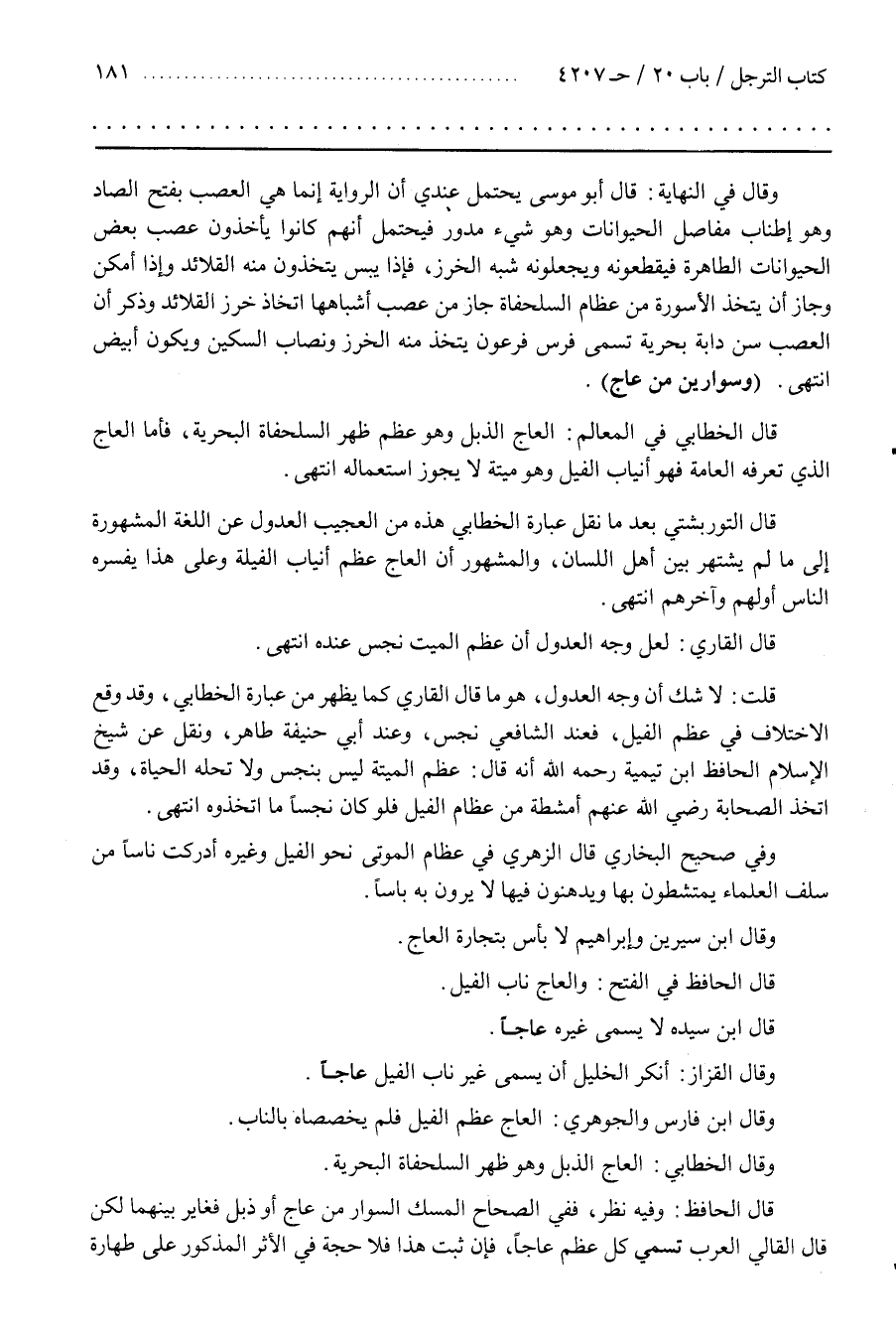 قَالَ الْحَافِظُ وَفِيهِ نَظَرٌ فَفِي الصحاح المسك السوار من عاج أو ذيل فَغَايَرَ بَيْنَهُمَا لَكِنْ قَالَ الْقَالِيُّ الْعَرَبُ تُسَمِّي كُلَّ عَظْمٍ عَاجًا فَإِنْ ثَبَتَ هَذَا فَلَا حُجَّةَ فِي الْأَثَرِ الْمَذْكُورِ عَلَى طَهَارَةِ