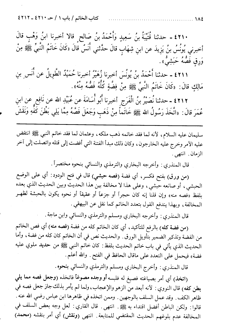 وَالْحَدِيثُ نَصٌّ فِي أَنَّ الْخَاتَمَ كَانَ كُلُّهُ مِنْ فِضَّةٍ وَأَمَّا الْحَدِيثُ الَّذِي يَأْتِي فِي بَابِ خَاتَمِ الْحَدِيدِ بِلَفْظِ كَانَ خَاتَمُ النَّبِيِّ صَلَّى اللَّهُ عَلَيْهِ وَسَلَّمَ مِنْ حَدِيدٍ مَلْوِيٍّ عَلَيْهِ فِضَّةٌ فَيُحْمَلُ عَلَى التَّعَدُّدِ عَلَى مَا قَالَ الْحَافِظُ فِي الْفَتْحِ