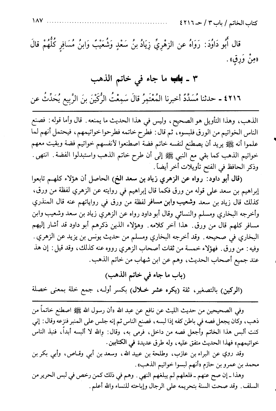 وَقَدْ رُوِيَ عَنْ الْبَرَاء بْن عَازِب وَطَلْحَة بْن عُبَيْد اللَّه وَسَعْد بْن أَبِي وَقَّاص وَأَبِي بَكْر بْن مُحَمَّد بْن عَمْرو بْن حَزْم أَنَّهُمْ لَبِسُوا خَوَاتِيم الذَّهَب