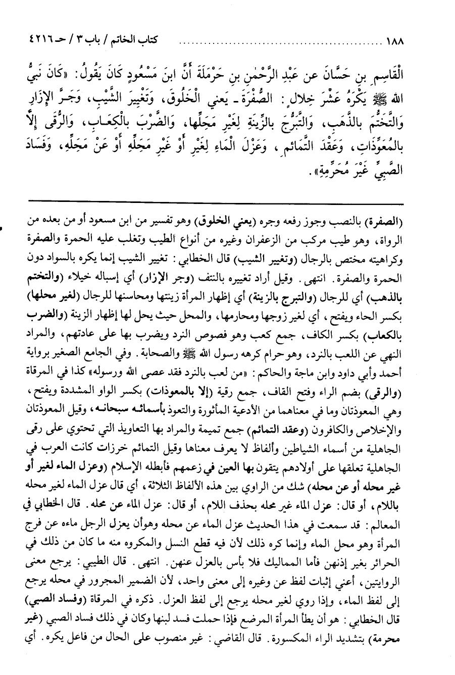 وَقِيلَ أَرَادَ تَغْيِيرَهُ بِالنَّتْفِ (وَجَرَّ الْإِزَارِ) أَي إِسْبَالَهُ خُيَلَاءَ (وَالتَّخَتُّمَ بِالذَّهَبِ) أَيْ لِلرِّجَالِ (وَالتَّبَرُّجَ بِالزِّينَةِ) أَيْ إِظْهَارَ الْمَرْأَةِ زِينَتَهَا وَمَحَاسِنَهَا لِلرِّجَالِ (لِغَيْرِ مَحَلِّهَا) بِكَسْرِ الْحَاءِ وَيُفْتَحُ أَيْ لِغَيْرِ زَوْجِهَا وَمَحَارِمِهَا وَالْمَحَلُّ حَيْثُ يَحِلُّ لَهَا إِظْهَارُ الزِّينَةِ (وَالضَّرْبَ بِالْكِعَابِ) بِكَسْرِ الْكَافِ جَمْعُ كَعْبٍ وَهُوَ فُصُوصُ النَّرْدِ وَيُضْرَبُ بِهَا عَلَى عَادَتِهِمْ وَالْمُرَادُ النَّهْيُ عَنِ اللَّعِبِ بِالنَّرْدِ وَهُوَ حَرَامٌ كَرِهَهُ رَسُولِ اللَّهِ صَلَّى اللَّهُ عَلَيْهِ وَسَلَّمَ وَالصَّحَابَةُ