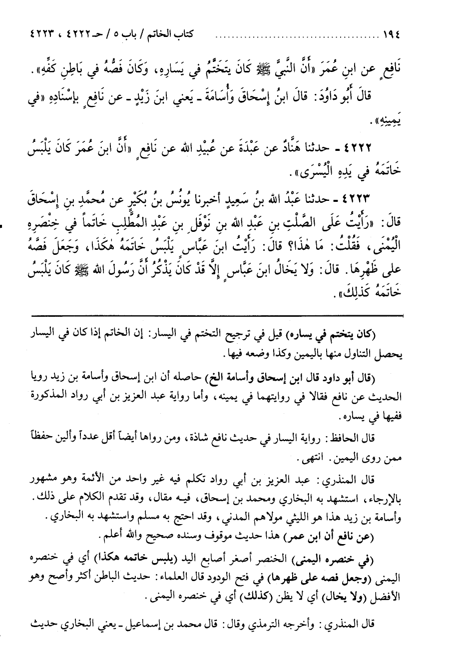 [4227] (كَانَ يَتَخَتَّمُ فِي يَسَارِهِ) قِيلَ فِي تَرْجِيحِ التَّخَتُّمِ فِي الْيَسَارِ إِنَّ الْخَاتَمَ إِذَا كَانَ فِي الْيَسَارِ يَحْصُلُ التَّنَاوُلُ مِنْهَا بِالْيَمِينِ وَكَذَا وضعه فيها