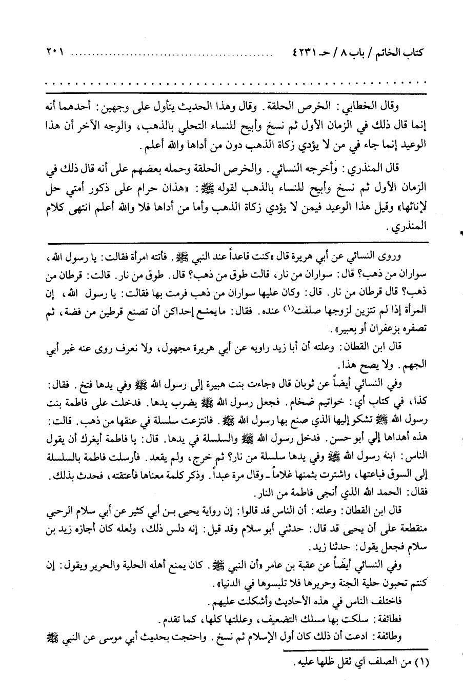 وَالْخُرْصُ الْحَلْقَةُ وَحَمَلَهُ بَعْضُهُمْ عَلَى أَنَّهُ قَالَ ذَلِكَ فِي الزَّمَانِ الْأَوَّلِ ثُمَّ نُسِخَ وَأُبِيحَ لِلنِّسَاءِ التَّحَلِّي بِالذَّهَبِ لِقَوْلِهِ صَلَّى اللَّهُ عَلَيْهِ وَسَلَّمَ هَذَانِ حَرَامٌ عَلَى ذُكُورِ أُمَّتِي حِلٌّ لِإِنَاثِهَا وَقِيلَ هَذَا الْوَعِيدُ فِيمَنْ لَا يُؤَدِّي زَكَاةَ الذَّهَبِ وَأَمَّا مَنْ أَدَّاهَا فَلَا وَاللَّهُ أَعْلَمُ انْتَهَى كَلَامُ الْمُنْذِرِيِّ