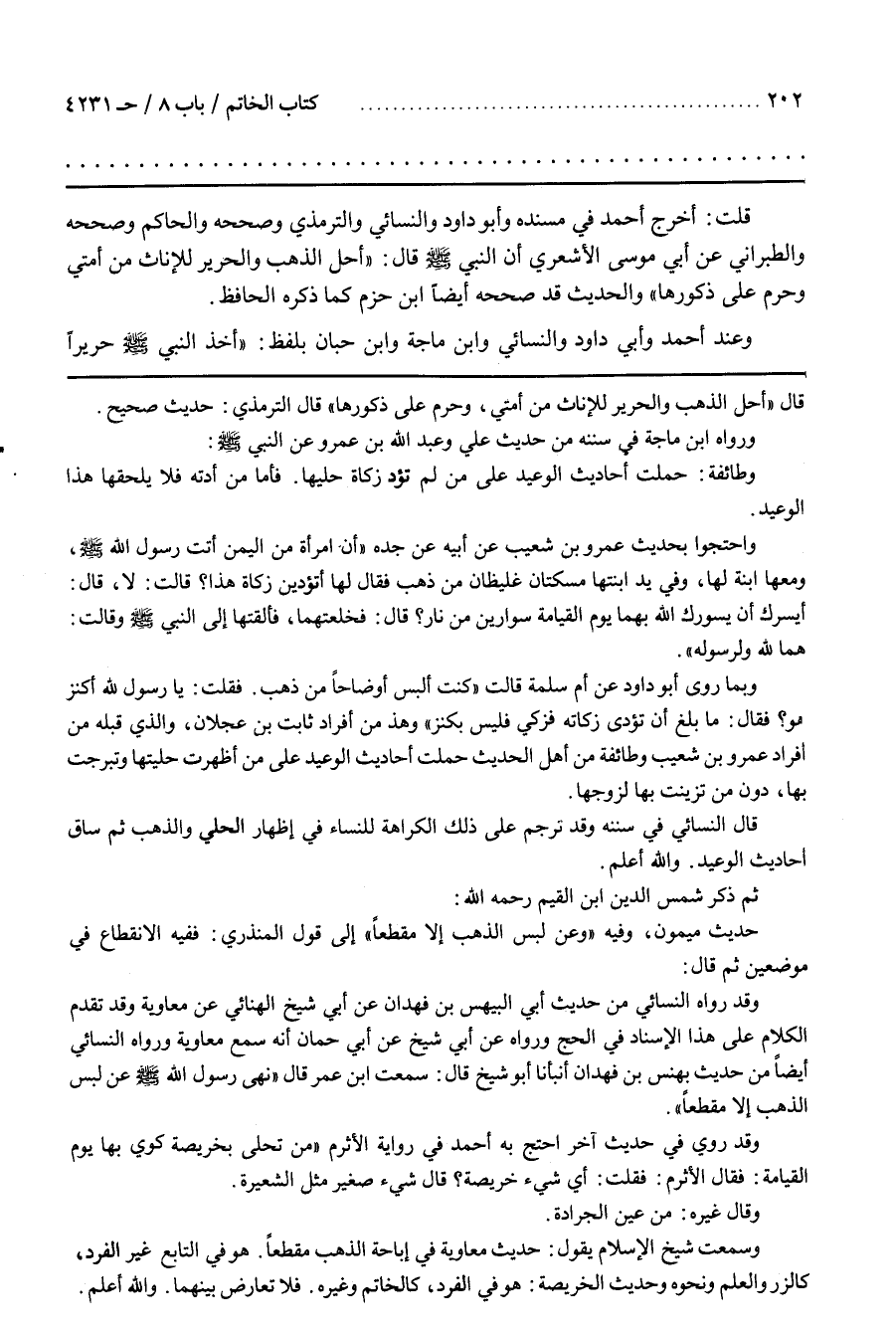 قُلْتُ أَخْرَجَ أَحْمَدُ فِي مُسْنَدِهِ وَأَبُو دَاوُدَ وَالنَّسَائِيُّ وَالتِّرْمِذِيُّ وَصَحَّحَهُ وَالْحَاكِمُ وَصَحَّحَهُ وَالطَّبَرَانِيُّ عَنْ أَبِي مُوسَى الْأَشْعَرِيِّ أَنَّ النَّبِيَّ صَلَّى اللَّهُ عَلَيْهِ وَسَلَّمَ قَالَ أُحِلَّ الذَّهَبُ وَالْحَرِيرُ لِلْإِنَاثِ مِنْ أُمَّتِي وَحُرِّمَ عَلَى ذُكُورِهَا وَالْحَدِيثُ قَدْ صححه أيضا بن حَزْمٍ كَمَا ذَكَرَهُ الْحَافِظُ