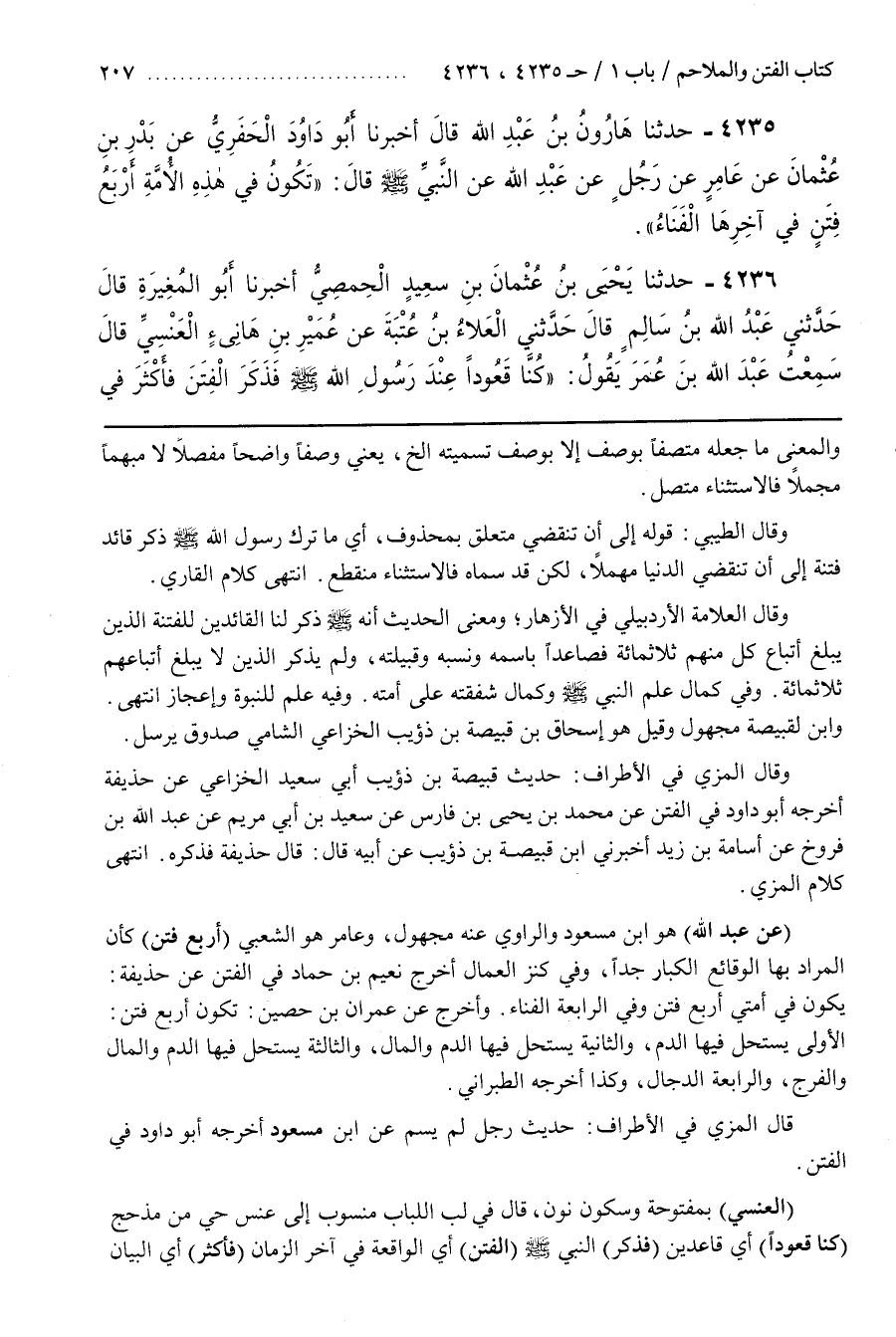 [4241] (عن عبد الله) هو بن مَسْعُودٍ وَالرَّاوِي عَنْهُ مَجْهُولٌ وَعَامِرٌ هُوَ الشَّعْبِيُّ (أَرْبَعُ فِتَنٍ) كَأَنَّ الْمُرَادَ بِهَا الْوَقَائِعُ الْكِبَارُ جِدًّا وَفِي كَنْزِ الْعُمَّالِ أَخْرَجَ نُعَيْمُ بْنُ حَمَّادٍ فِي الْفِتَنِ عَنْ حُذَيْفَةَ يَكُونُ فِي أُمَّتِي أَرْبَعُ فِتَنٍ وَفِي الرَّابِعَةِ الْفَنَاءُ