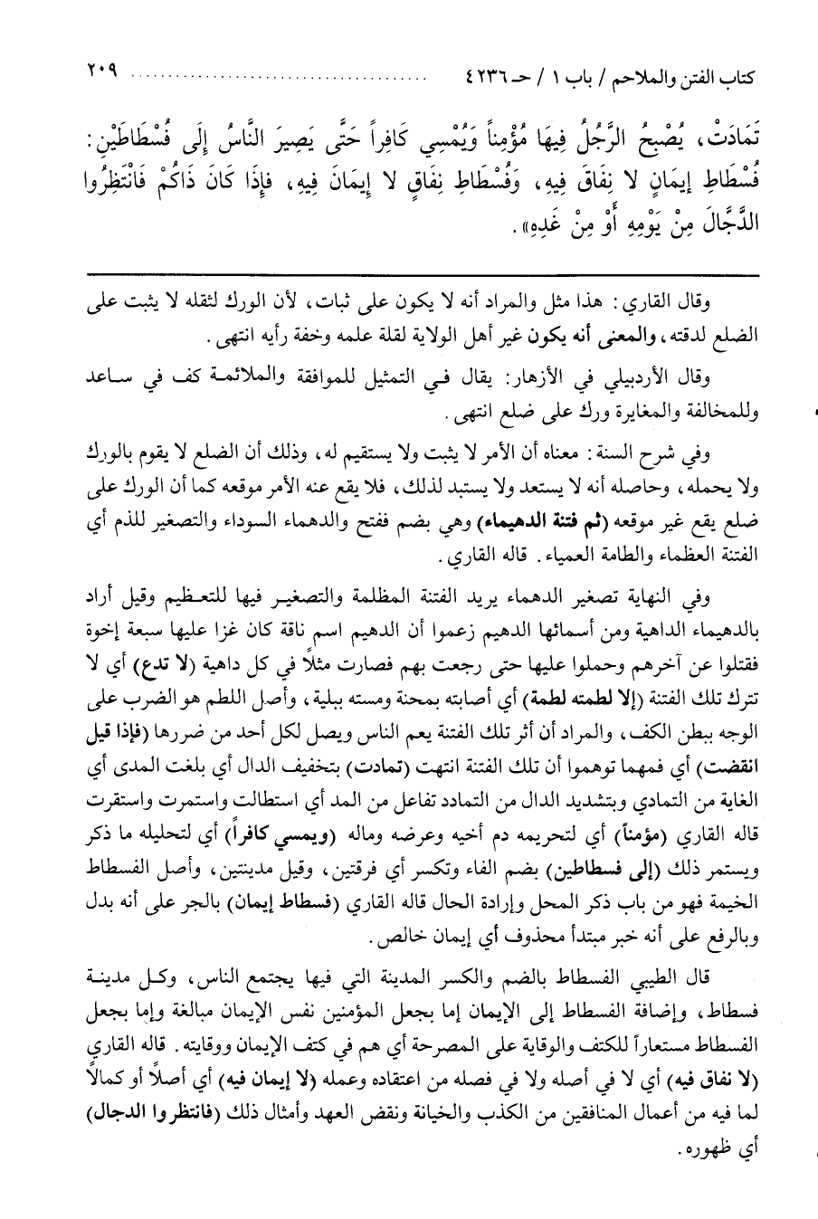 وَفِي النِّهَايَةِ تَصْغِيرُ الدَّهْمَاءِ الْفِتْنَةُ الْمُظْلِمَةُ وَالتَّصْغِيرُ فِيهَا لِلتَّعْظِيمِ وَقِيلَ أَرَادَ بِالدُّهَيْمَاءِ الدَّاهِيَةَ وَمِنْ أَسْمَائِهَا الدُّهَيْمُ زَعَمُوا أَنَّ الدُّهَيْمَ اسْمُ نَاقَةٍ كَانَ غَزَا عَلَيْهَا سَبْعَةُ إِخْوَةٍ فَقُتِلُوا عَنْ آخِرهِمْ وَحُمِلُوا عَلَيْهَا حَتَّى رَجَعَتْ بِهِمْ فَصَارَتْ مَثَلًا فِي كُلِّ دَاهِيَةِ (لَا تَدَعُ) أَيْ لَا تَتْرُكُ تِلْكَ الْفِتْنَةُ (إِلَّا لَطَمَتْهُ لَطْمَةً) أَيْ أَصَابَتْهُ بِمِحْنَةٍ وَمَسَّتْهُ بِبَلِيَّةٍ وَأَصْلُ اللَّطْمِ هُوَ الضَّرْبُ عَلَى الْوَجْهِ بِبَطْنِ الْكَفِّ وَالْمُرَادُ أَنَّ أَثَرَ تِلْكَ الْفِتْنَةِ يَعُمُّ النَّاسَ وَيَصِلُ لِكُلِّ أَحَدٍ مِنْ ضَرَرِهَا (فَإِذَا قِيلَ انْقَضَتْ) أَيْ فَمَهْمَا تَوَهَّمُوا أَنَّ تِلْكَ الْفِتْنَةَ انْتَهَتْ (تَمَادَتْ) بِتَخْفِيفِ الدَّالِ أَيْ بَلَغَتِ الْمَدَى أَيِ الْغَايَةَ مِنَ التَّمَادِي وَبِتَشْدِيدِ الدَّالِ مِنَ التَّمَادُدِ تَفَاعُلٌ مِنَ الْمَدِّ أَيِ اسْتَطَالَتْ وَاسْتَمَرَّتْ وَاسْتَقَرَّتْ قاله القارىء (مُؤْمِنًا) أَيْ لِتَحْرِيمِهِ دَمَ أَخِيهِ وَعِرْضَهُ وَمَالَهُ (وَيُمْسِي كَافِرًا) أَيْ لِتَحْلِيلِهِ مَا ذُكِرَ وَيَسْتَمِرُّ ذَلِكَ (إِلَى فُسْطَاطَيْنِ) بِضَمِّ الْفَاءِ وَتُكْسَرُ أَيْ فِرْقَتَيْنِ وَقِيلَ مَدِينَتَيْنِ وَأَصْلُ الْفُسْطَاطِ الْخَيْمَةُ فَهُوَ مِنْ بَابِ ذِكْرِ الْمَحَلِّ وَإِرَادَةِ الْحَالِّ قَالَهُ القارىء (فُسْطَاطِ إِيمَانٍ) بِالْجَرِّ عَلَى أَنَّهُ بَدَلٌ وَبِالرَّفْعِ عَلَى أَنَّهُ خَبَرُ مُبْتَدَأٍ مَحْذُوفٍ أَيْ إِيمَانٌ خَالِصٌ